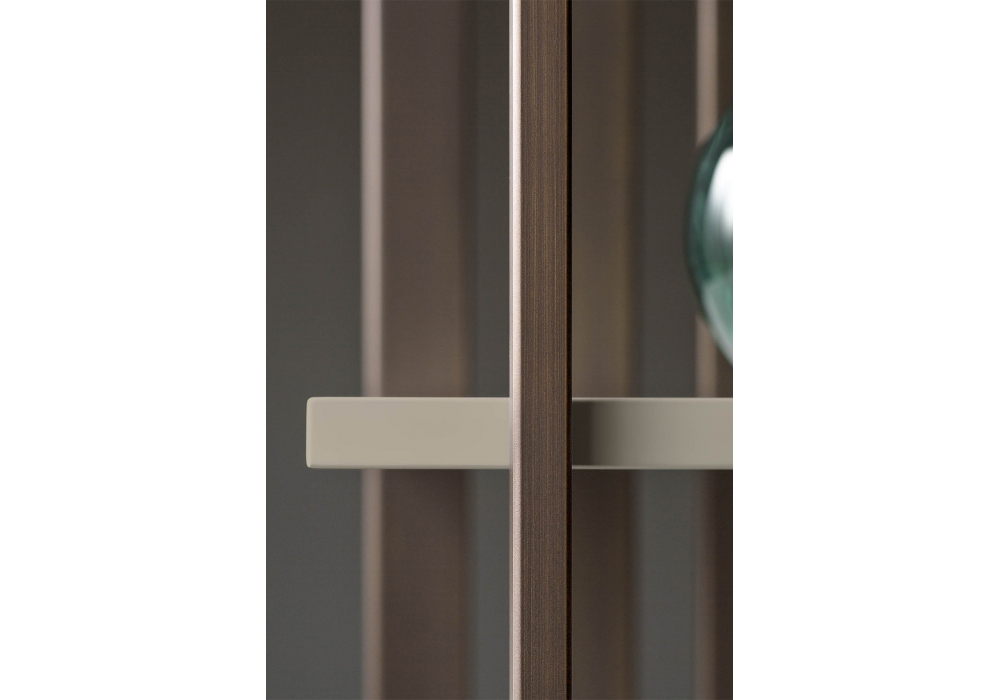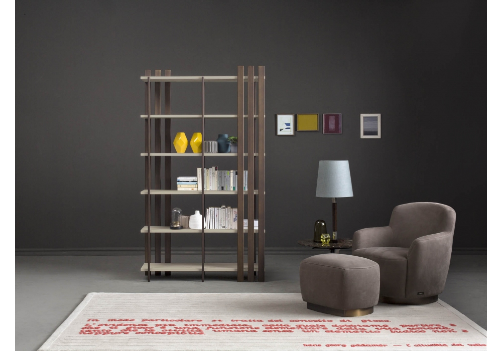 Tower designed by Giuseppe Manzoni for Bodema is a bookcase with metal supporting structure, available in brushed bronze or matt Manganese lacquered finishes. Shelves available in embossed matt lacquered, glossy lacquered or canaletto walnut finishes.