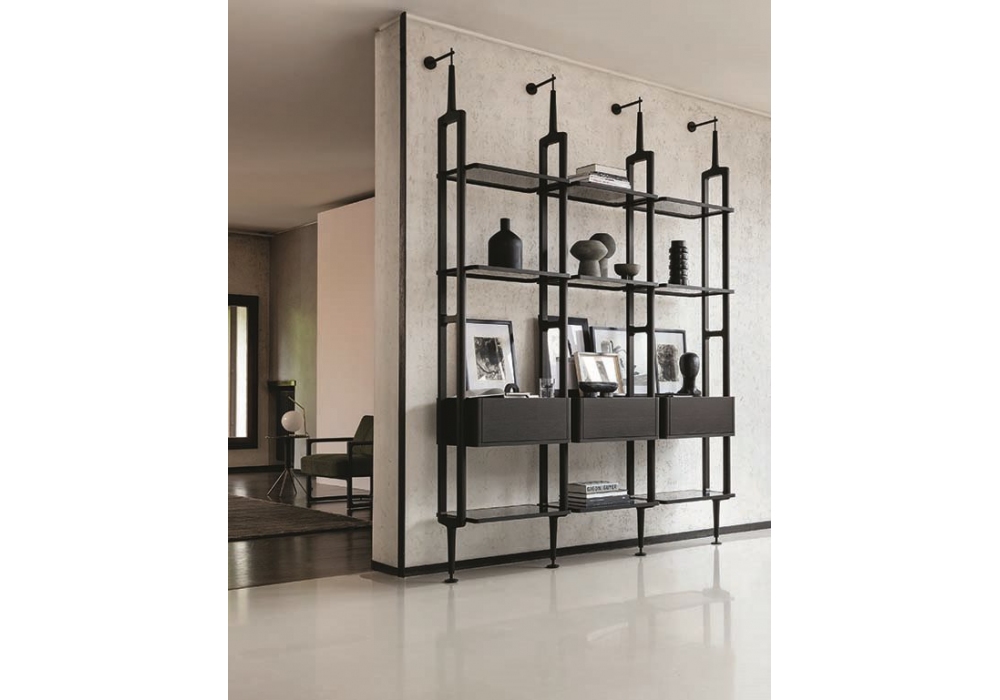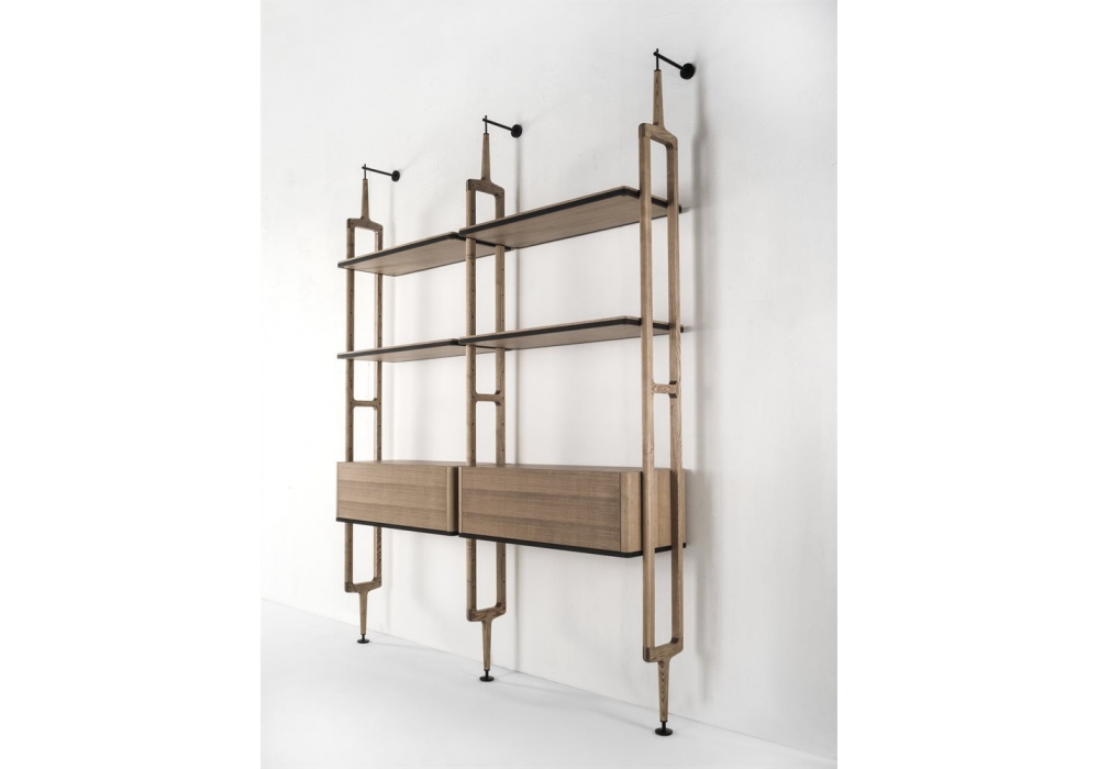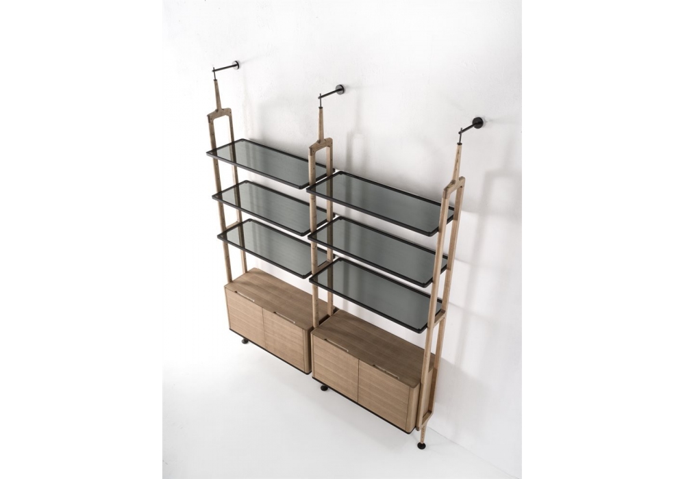 Aria designed by D. Dolcini for Porada is a modular bookcase with supporting columns in ash and fixing to the ceiling or wall. It is possible to customize the composition through shelves in ash or smoked glass, chest of drawers and containers in ash supported by an matt black metal frame. For other compositions contact customer service.