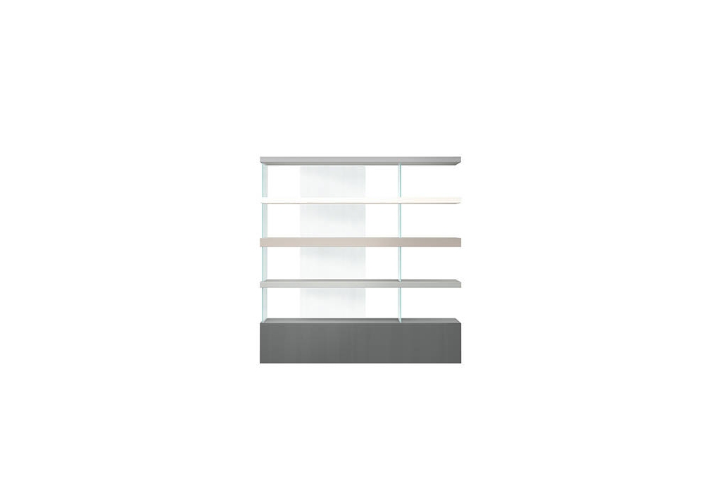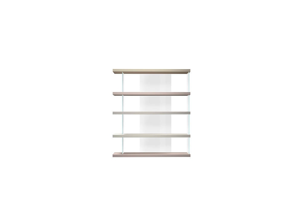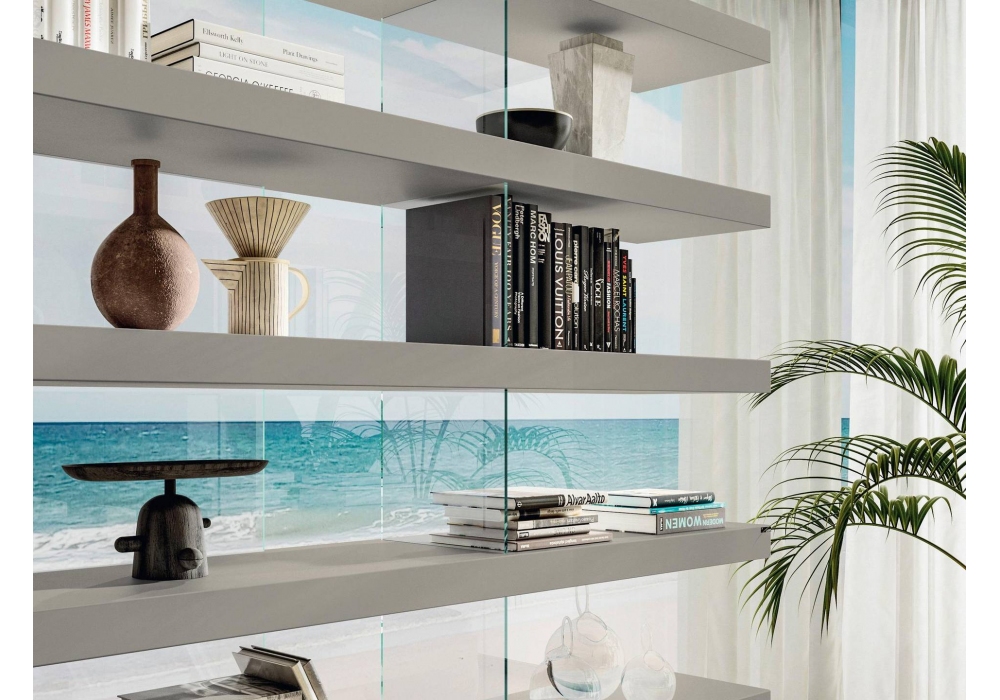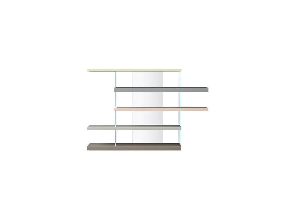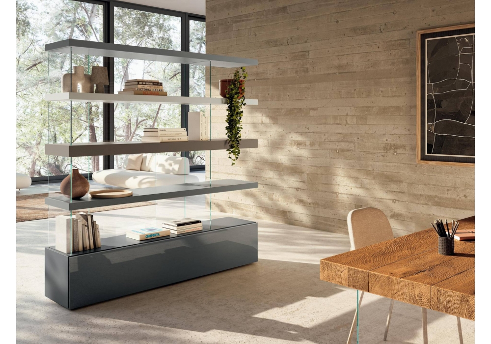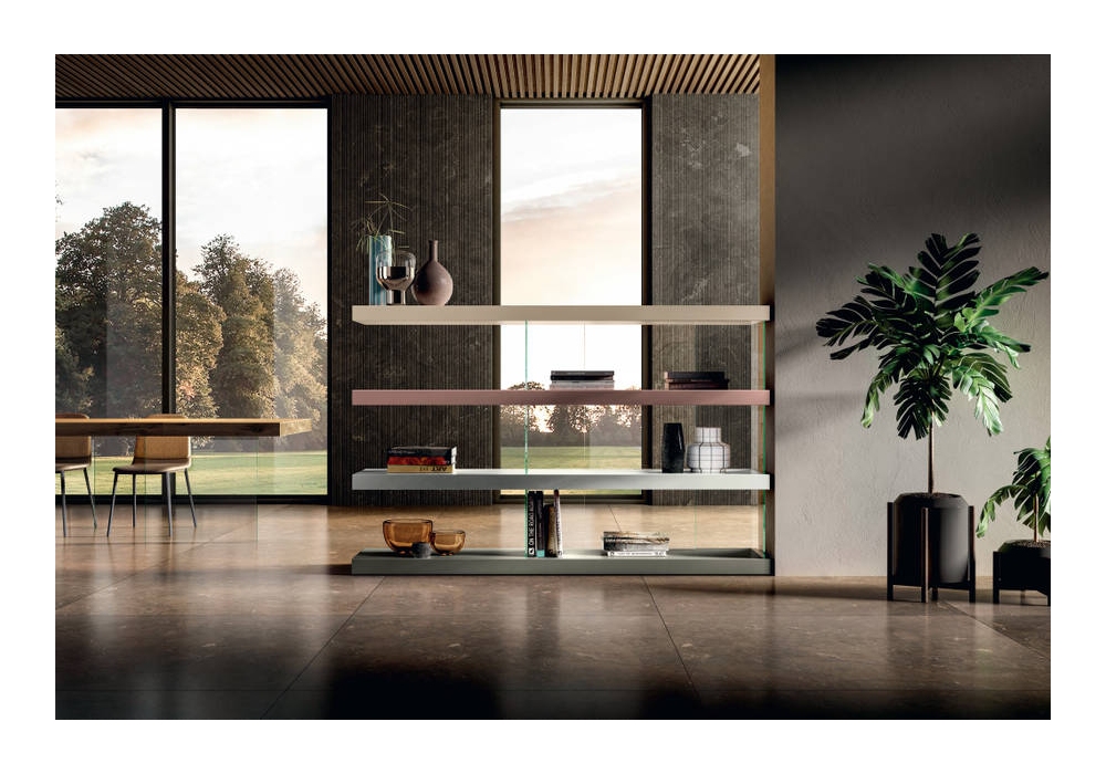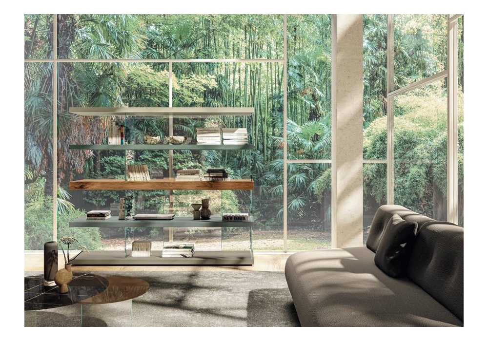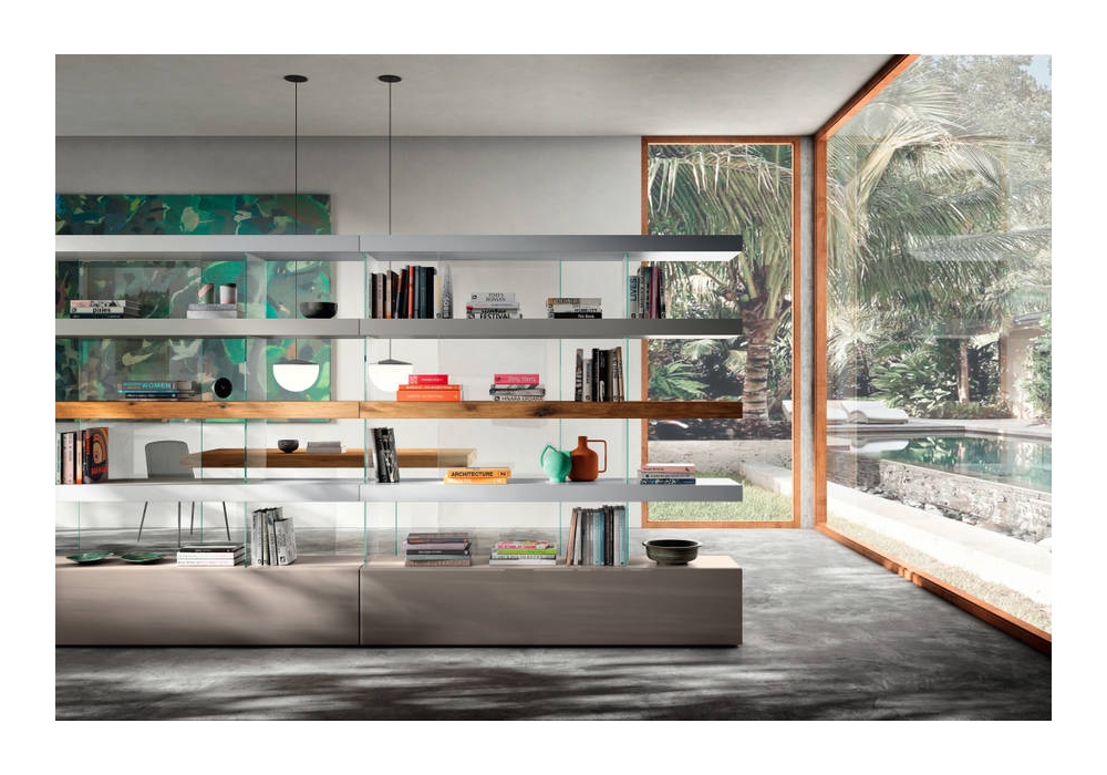 Air Shelf designed by Daniele Lago is a bookcase with shelves and containers suspended on glass supports. It is available in different compositions.