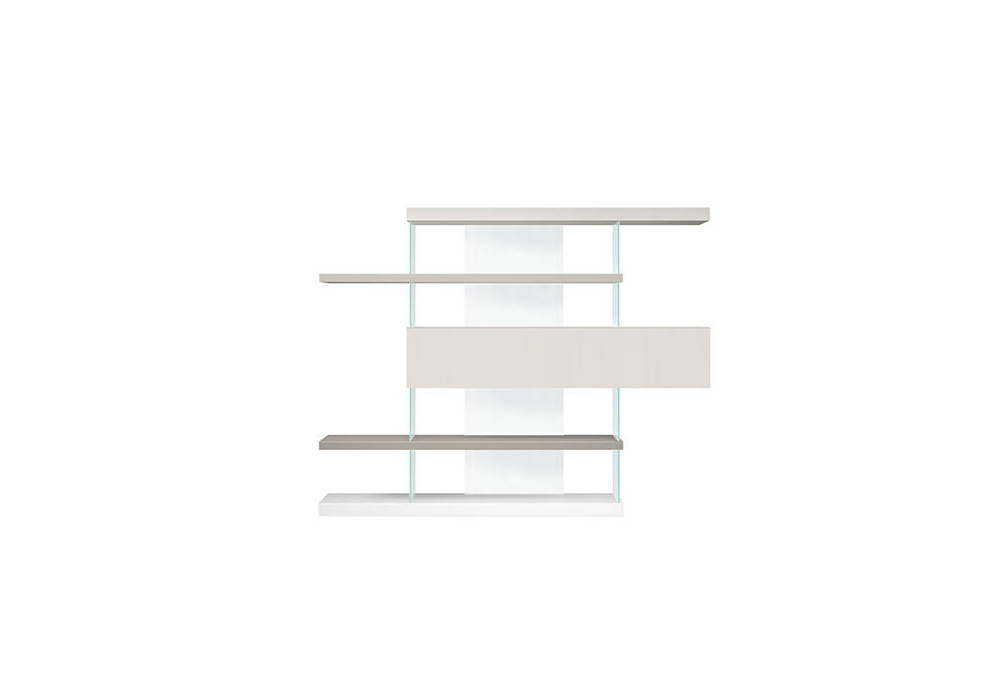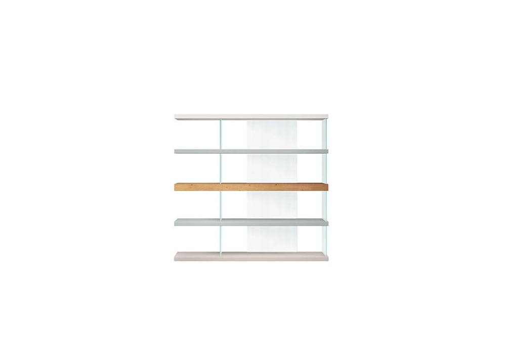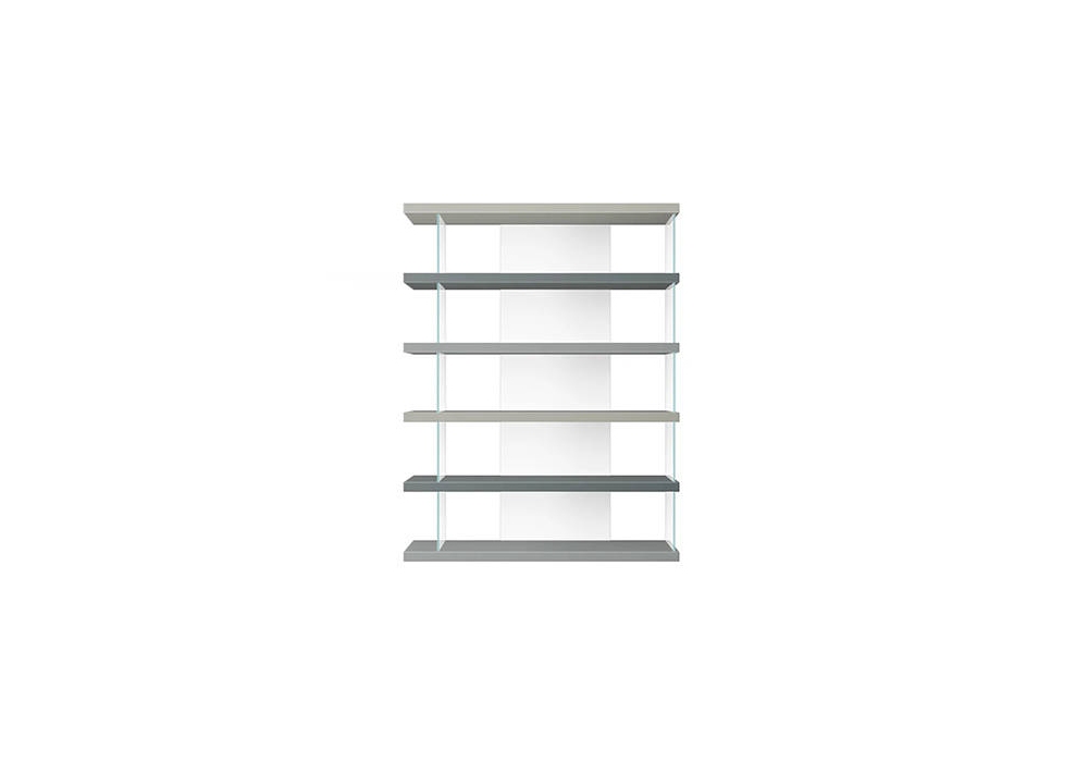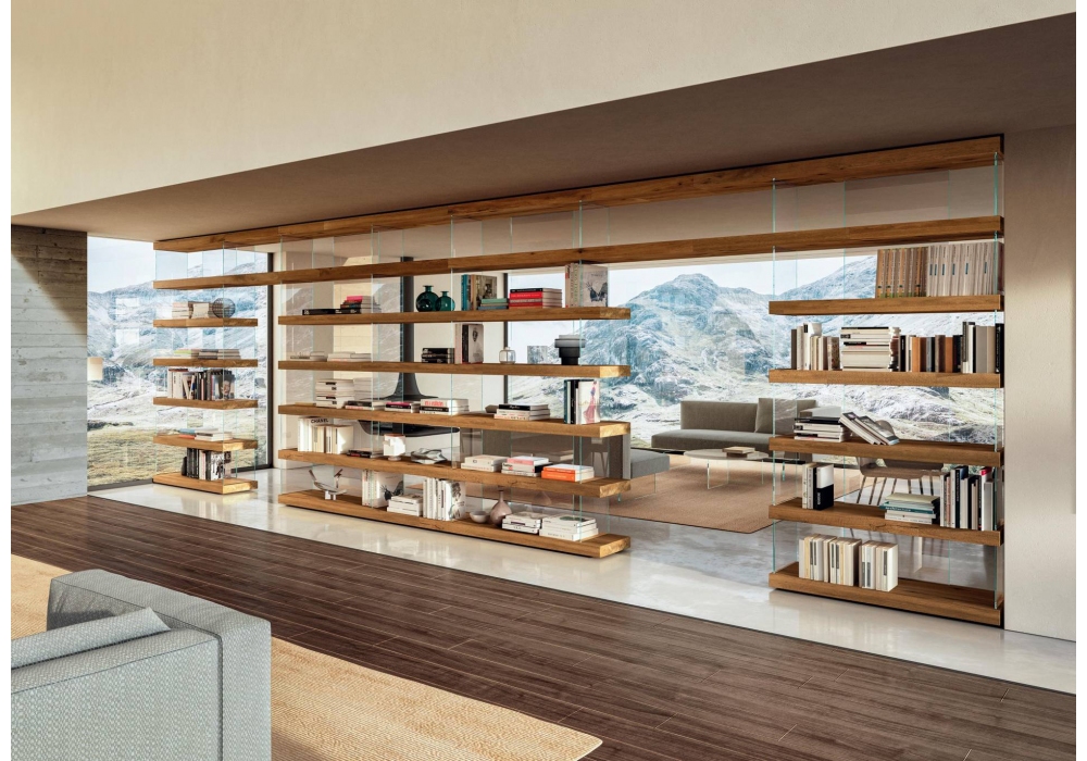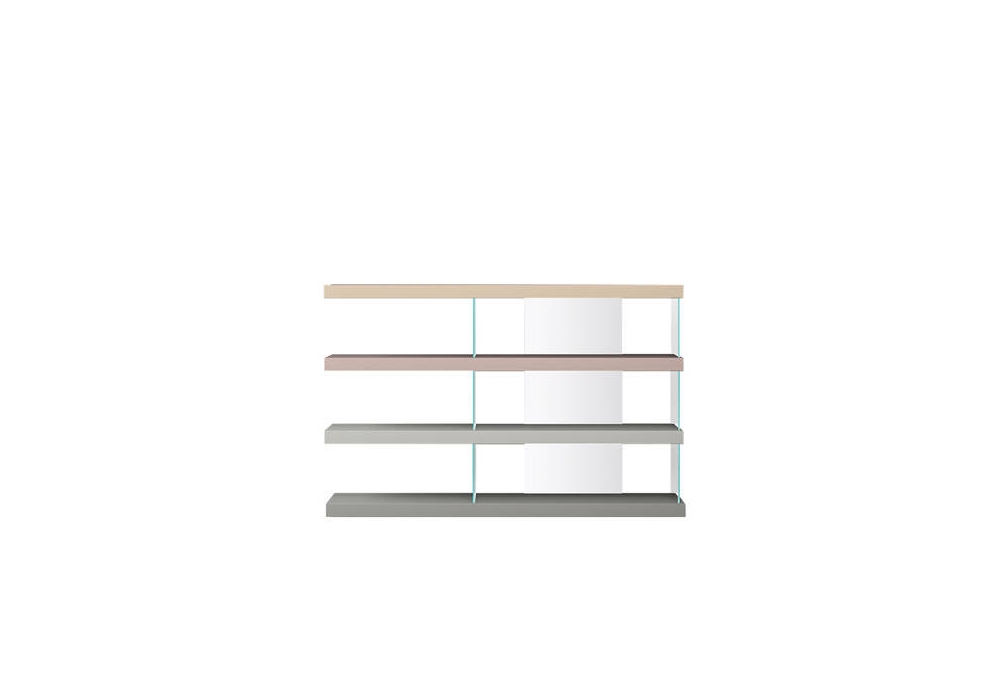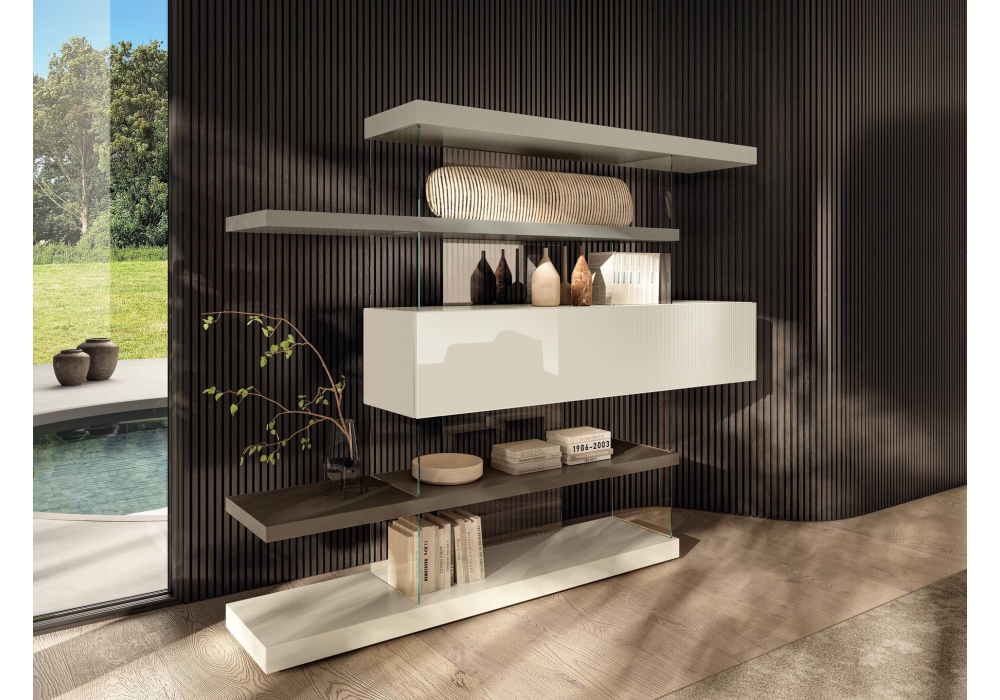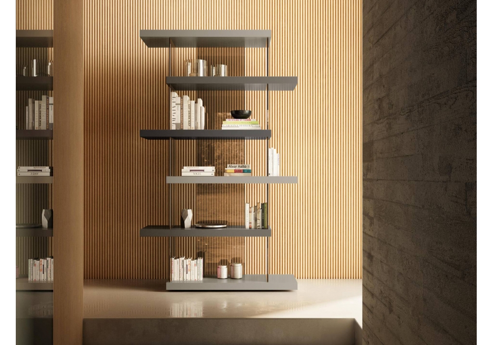 Air Shelf designed by Daniele Lago is a bookcase with shelves and containers suspended on glass supports. It is available in different compositions.