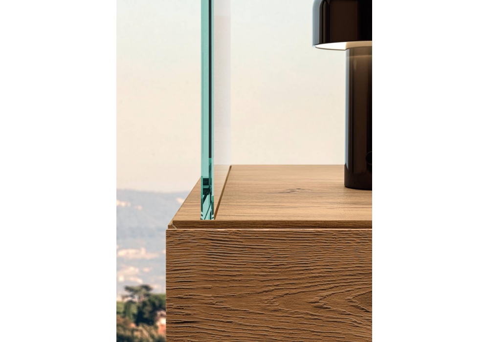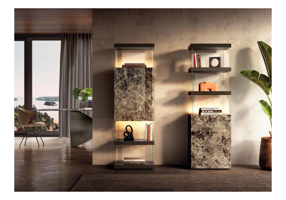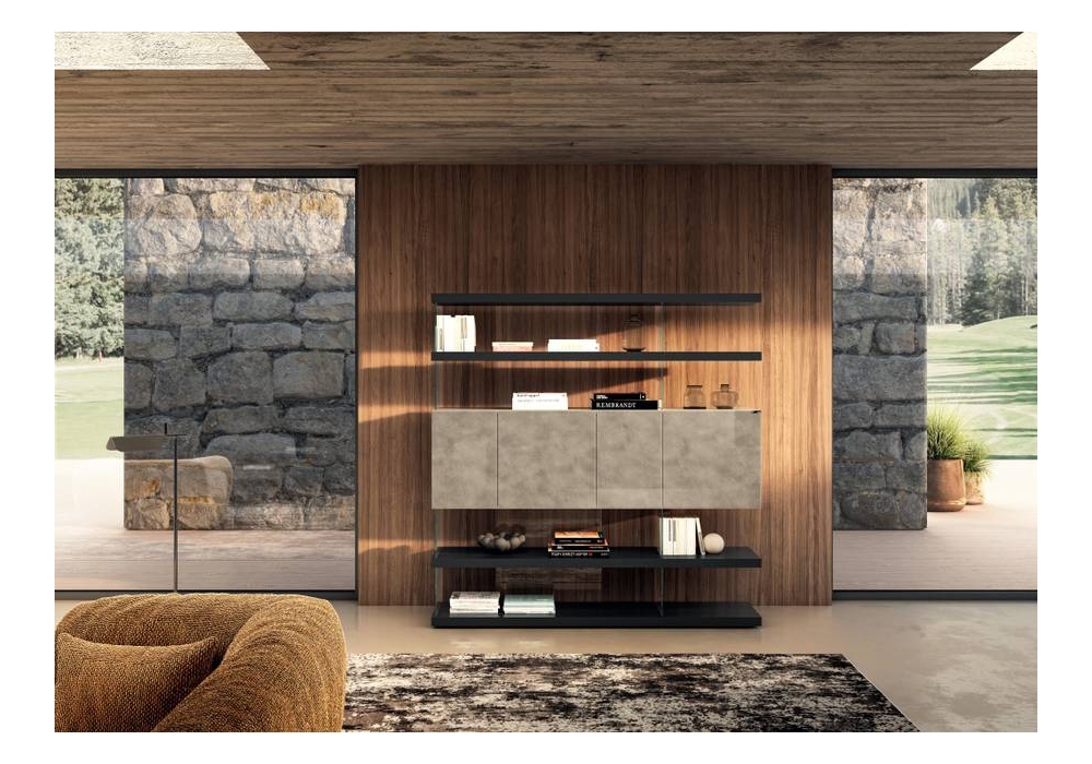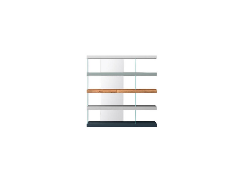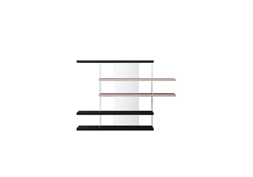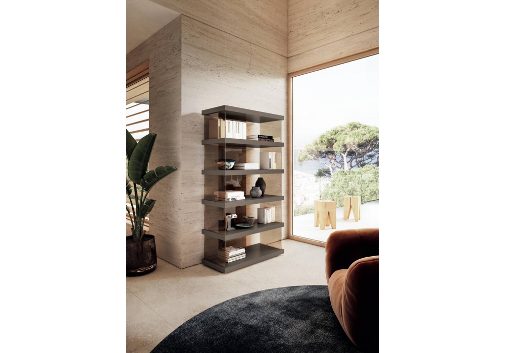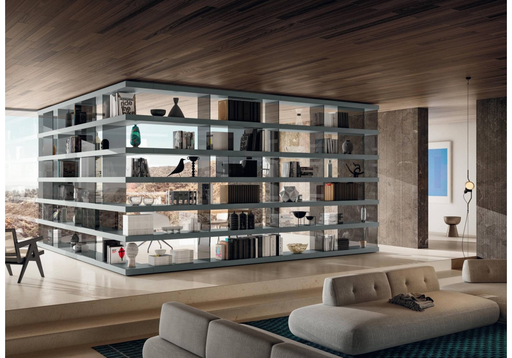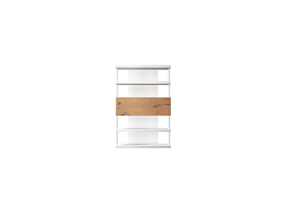 Air Shelf designed by Daniele Lago is a bookcase with shelves and containers suspended on glass supports. It is available in different compositions.