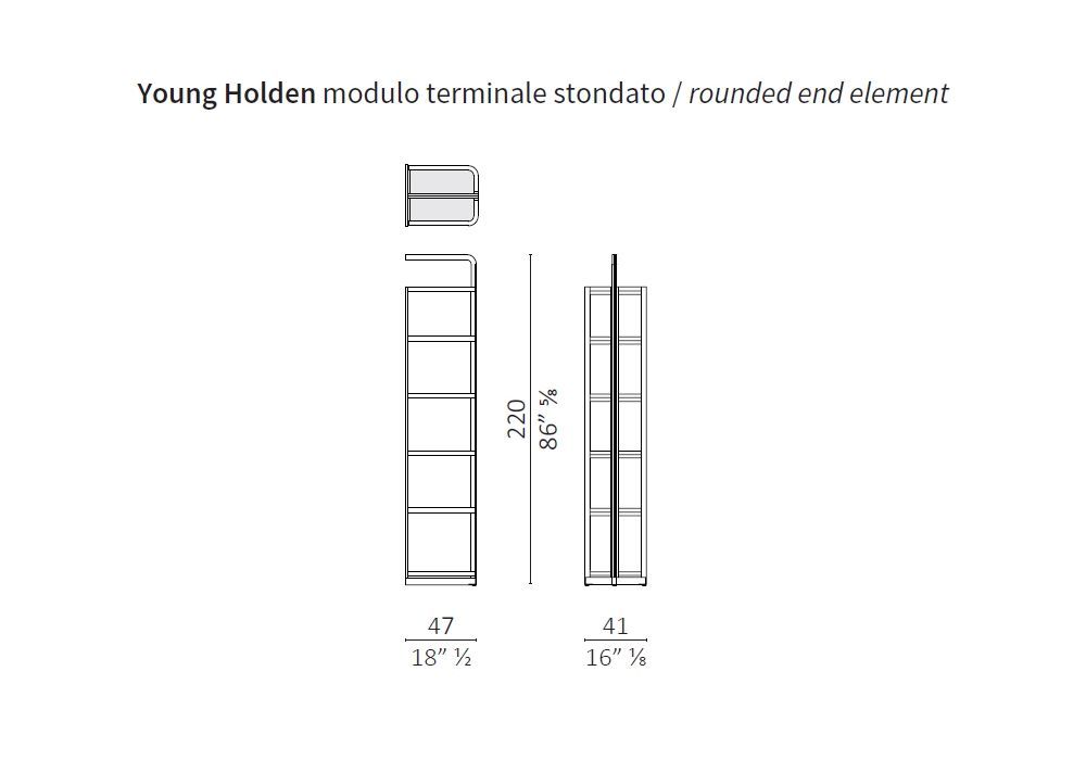 Young Holden designed by Roberto Lazzeroni for Ceccotti Collezioni is a modular freestanding bookcase made in solid American walnut. Shelves and bookstop in glass transparent, bronzed or smoked. Adjustable feet in satin stainless steel.