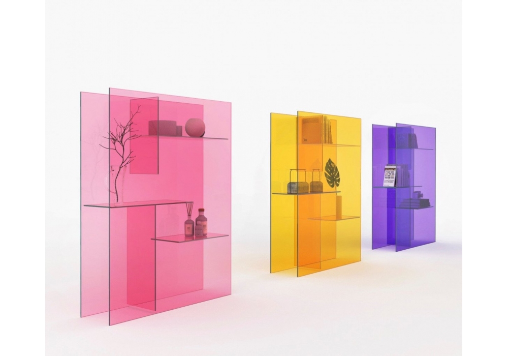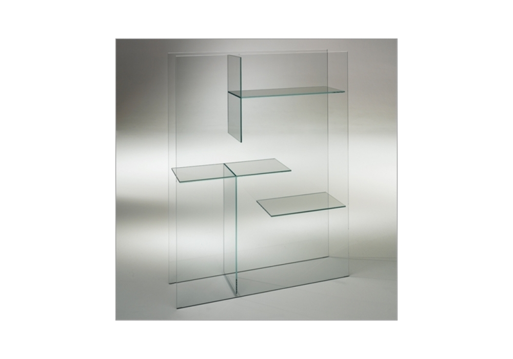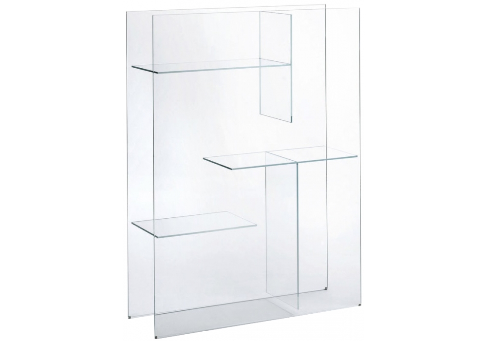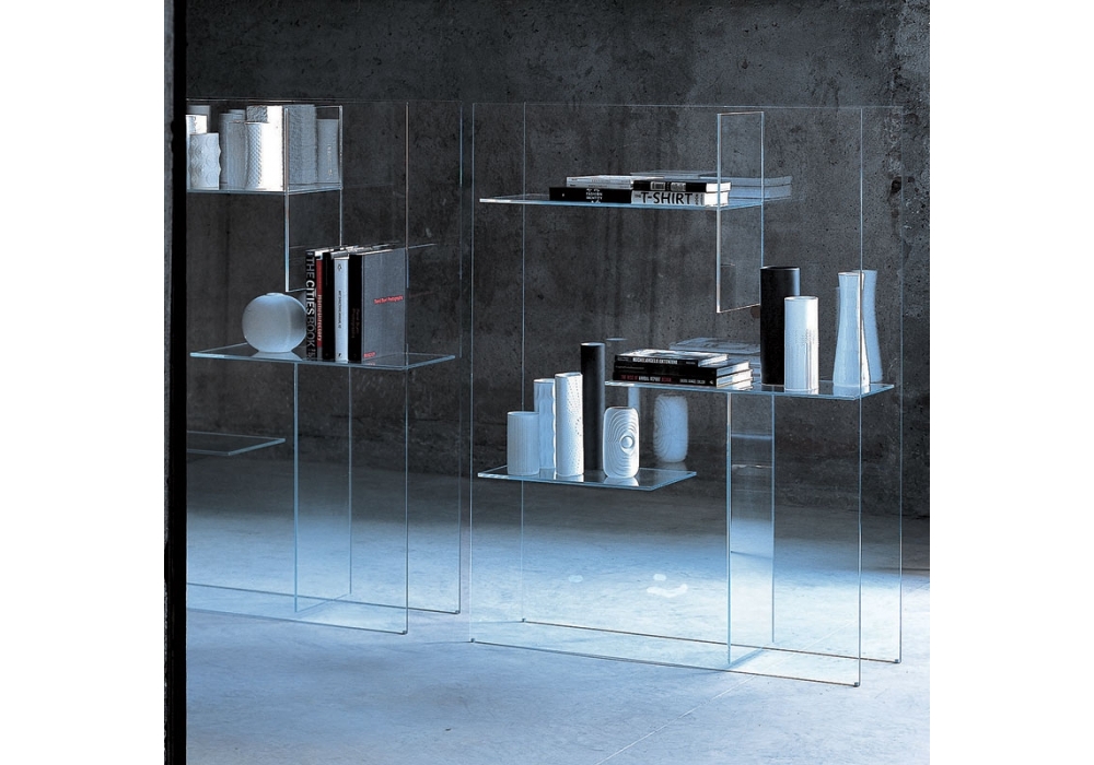Transfix designed by Marc Krusin and Kensaku Oshiro for Glas Italia is a bookcase made by gluing 5 + 5 mm laminated glass plates. Available in transparent extralight or transparent colored glass, in different finishes.