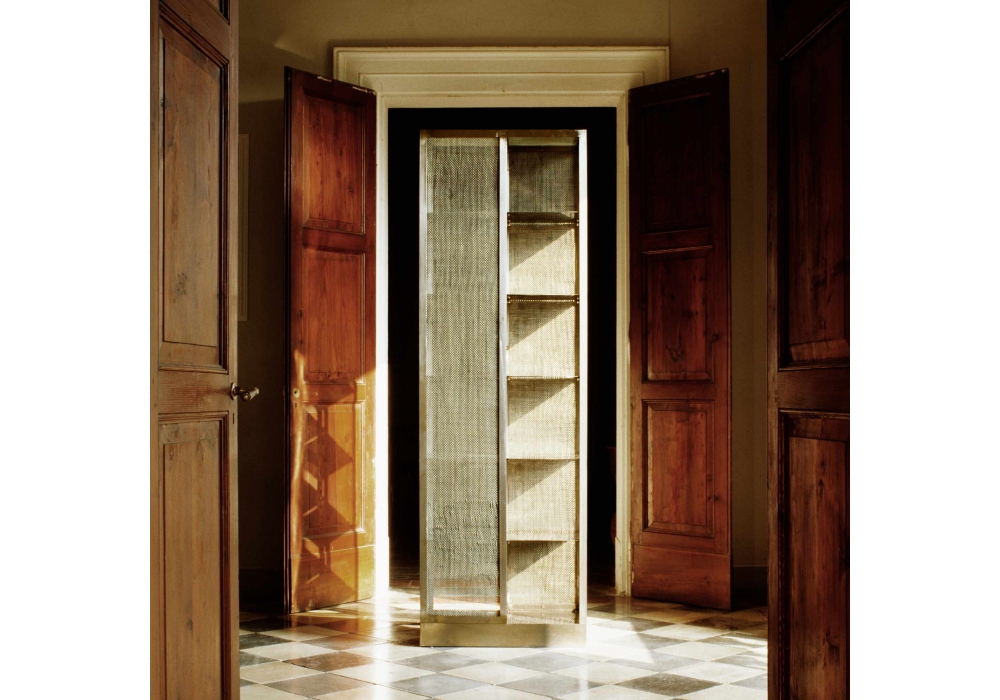 Rachel designed by Juliao Sarmento for Memphis Milano is a bookcase made of iron sheet and metal mesh. Limited edition of 25 pieces.