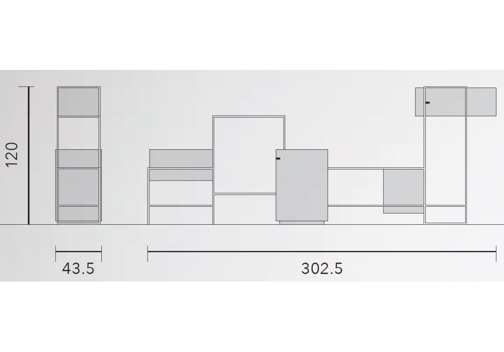 Katai designed by Giacomo Moor for Memphis Milano is a horizontal equipped wall with an iron supporting structure that develops horizontally and wraps four volumes in walnut wood with alternating opening modes; the first and third with trap door, the second and fourth with hinged door. Limited edition of 25 pieces.