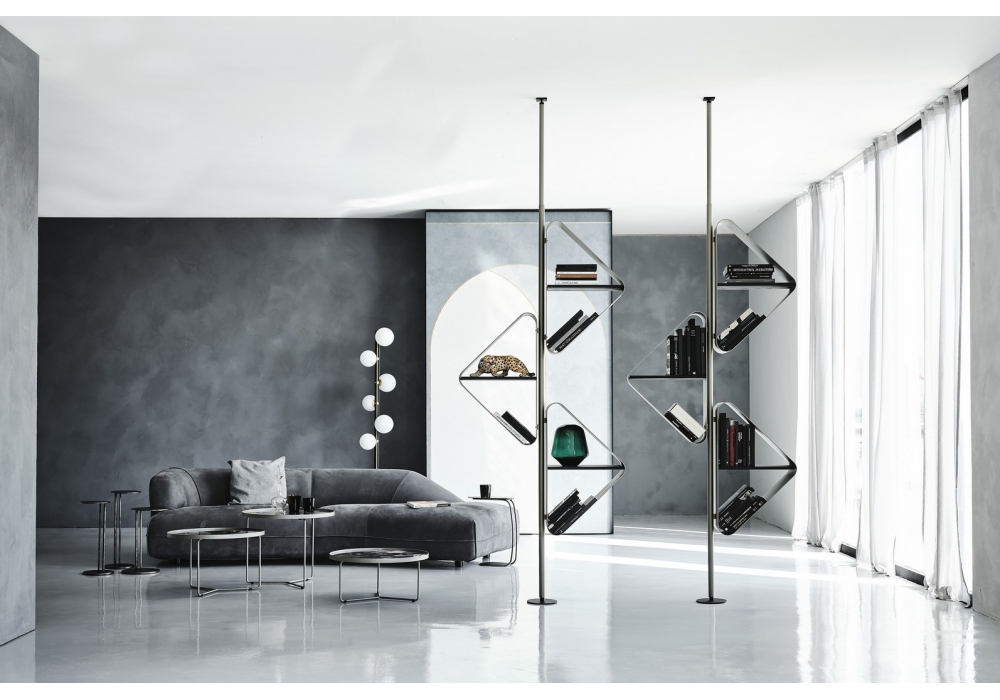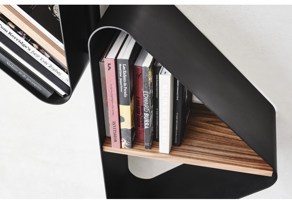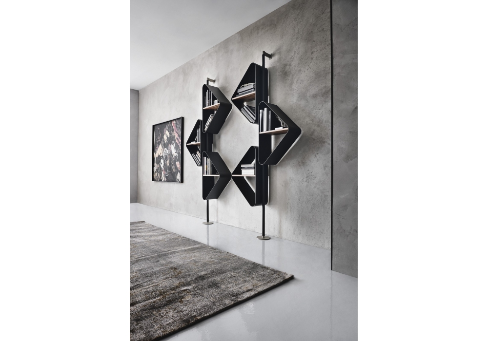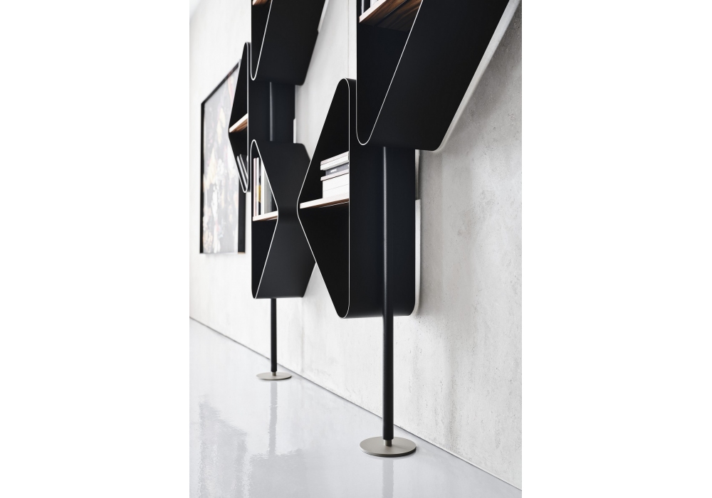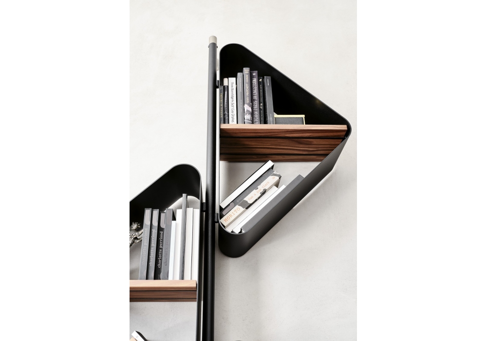 Spinnaker designed by Tosca Design for Cattelan Italia is a bookshelf in wall- or ceiling-hanging version. It's made of embossed lacquered steel structure and wooden shelves available in the following combinations: black with shelves in Noce Canaletto and details in titanium or titanium with shelves in Elm open pore black and details in black.
