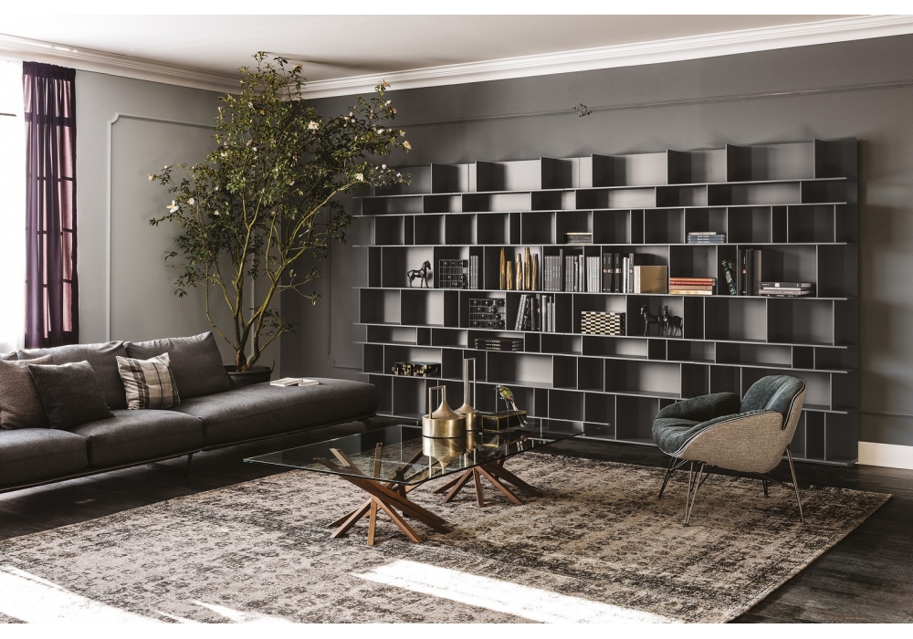 Wally designed by Philip Jackson for Cattelan Italia is a modular bookshelf with structure made of lacquered MDF in titanium, bronze or white colour.