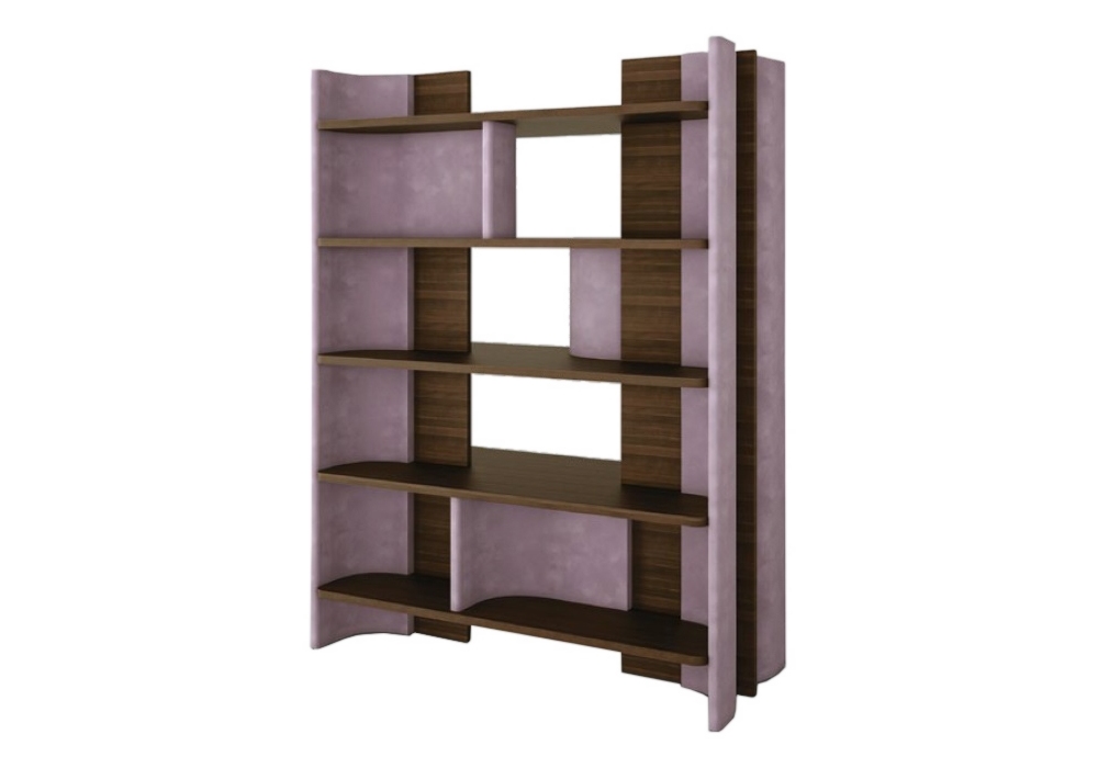 Joni designed by Christophe Delcourt for Baxter is a bookcase with structure in brushed veneered plywood oak stained in Caramel, Charcoal or Tobacco tone. Leather-covered curved elements. Adjustable feet. Available freestanding or fastened to wall.