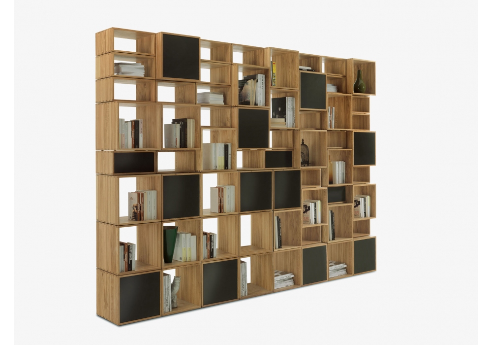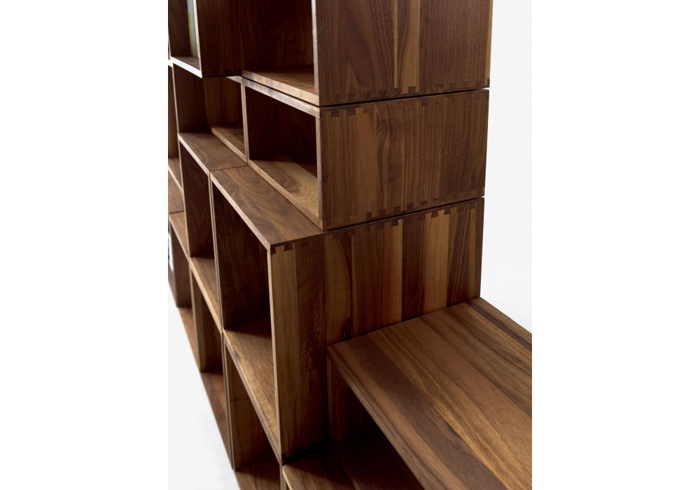 Freedom designed by Riva 1920 is a bookshelf made of solid wood, made up of stackable modular modules that can be joined together through specific assembly hardware. Flexible on the basis of furnishing needs, sees the possibility of inserting backrests, doors and drawers assembled with dovetail joints and equipped with a push-pull opening system and metal guides. Available with fixed or swiveling TV compartment, equipped with cable management system. On request it is available with "double-sided" elements and can be used as a dividing element within the environment.