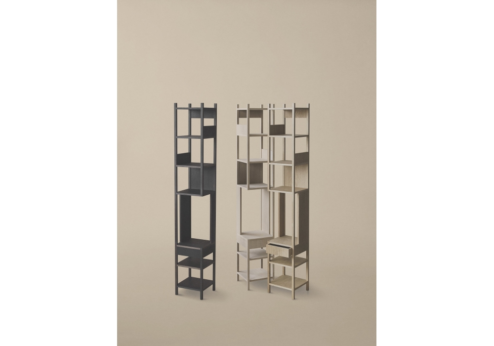 Lungangolo designed by Achille Castiglioni for Karakter is a shelving unit made of veneered and treated solid oak. Available in different finishes and models.