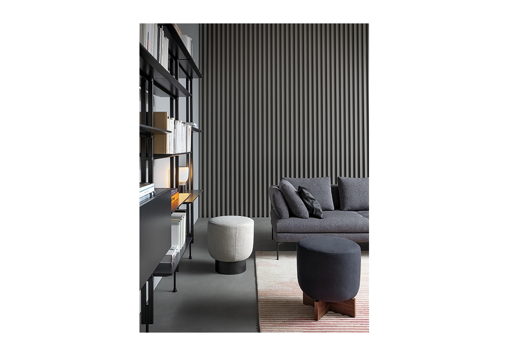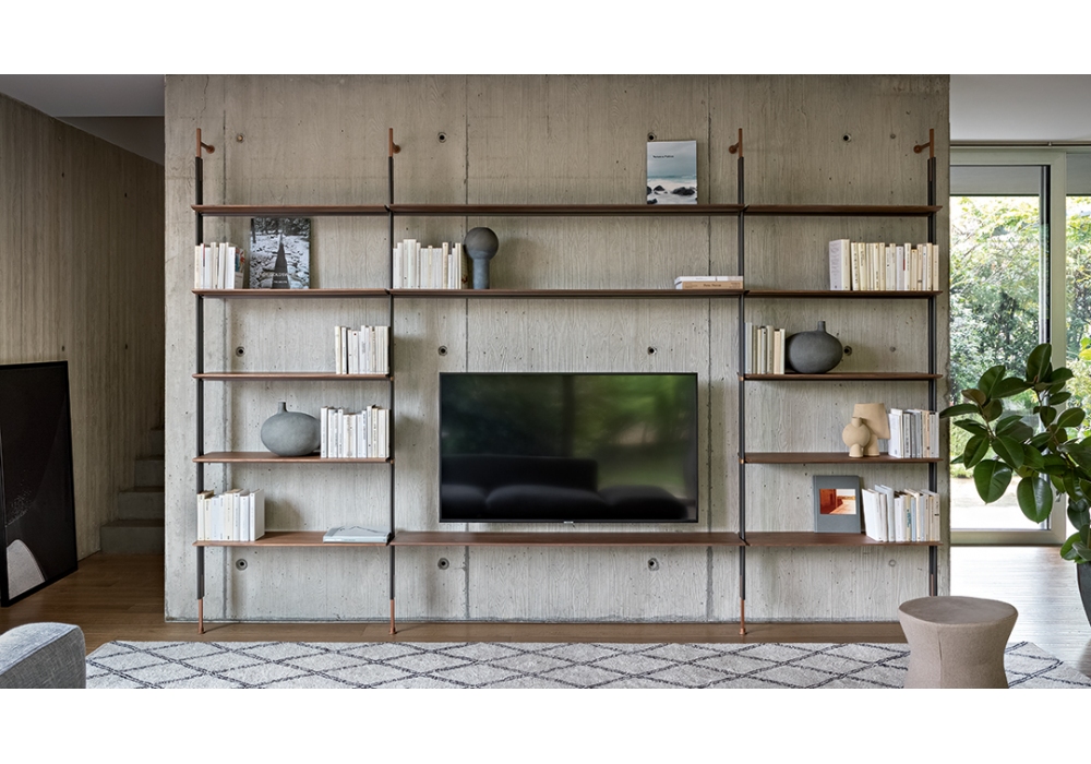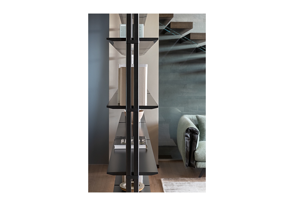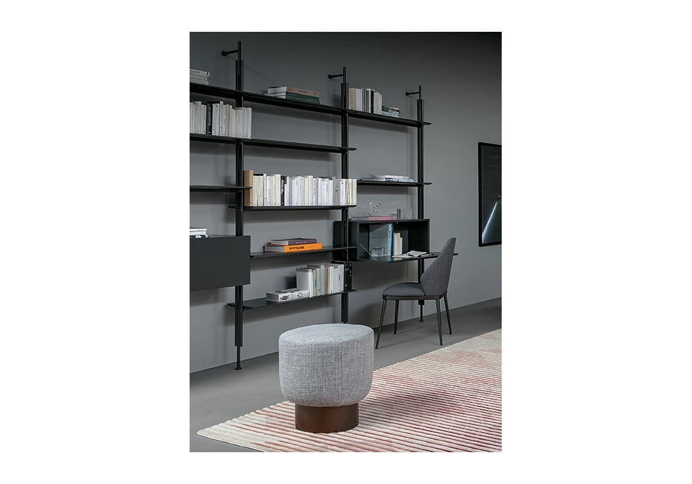 Roll designed by Dondoli & Pocci for Bonaldo is a bookcase with wall or ceiling fixing, with shelves in matt lead lacquered wood or canaletto walnut veneer. The upright is in lead painted metal, with details in different finishes. Available in numerous compositions.