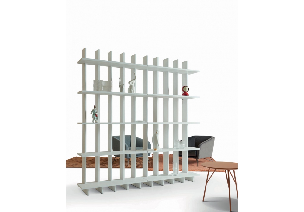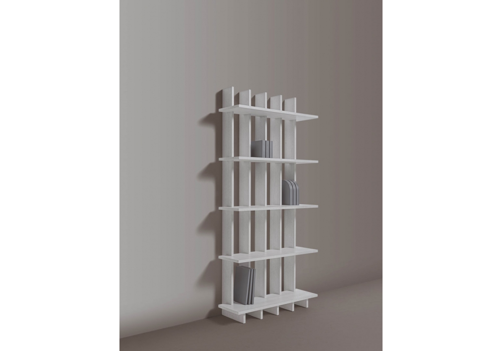Babele designed by Fabio Bortolani for My Home Collection is a bookcase in lacquered MDF with large protruding shelves. Babele is available in different finishes.