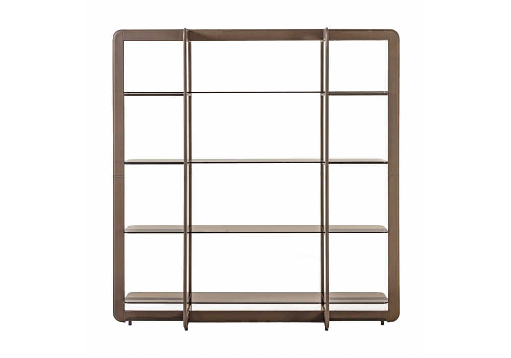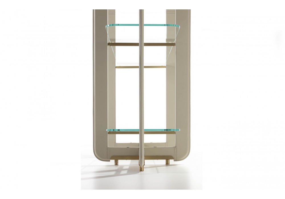 Musa designed by RedCreative for Enrico Pellizzoni is a bookcase with metal tubular structure covered in leather, crystal shelves and brass or painted metal details.