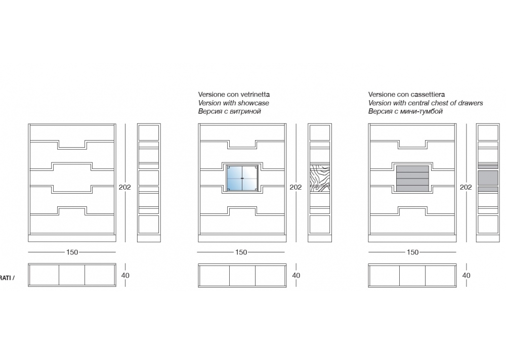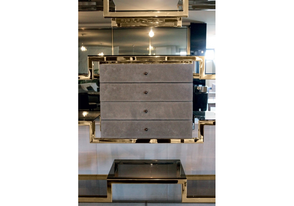 Etruria designed by AL1 for Longhi is a bookshelf with metal structure, shelves in bronze or smoked tempered glass and lower shelf in veneered wood. Available in the version with chest of drawers or showcase in wood or upholstery in leather.