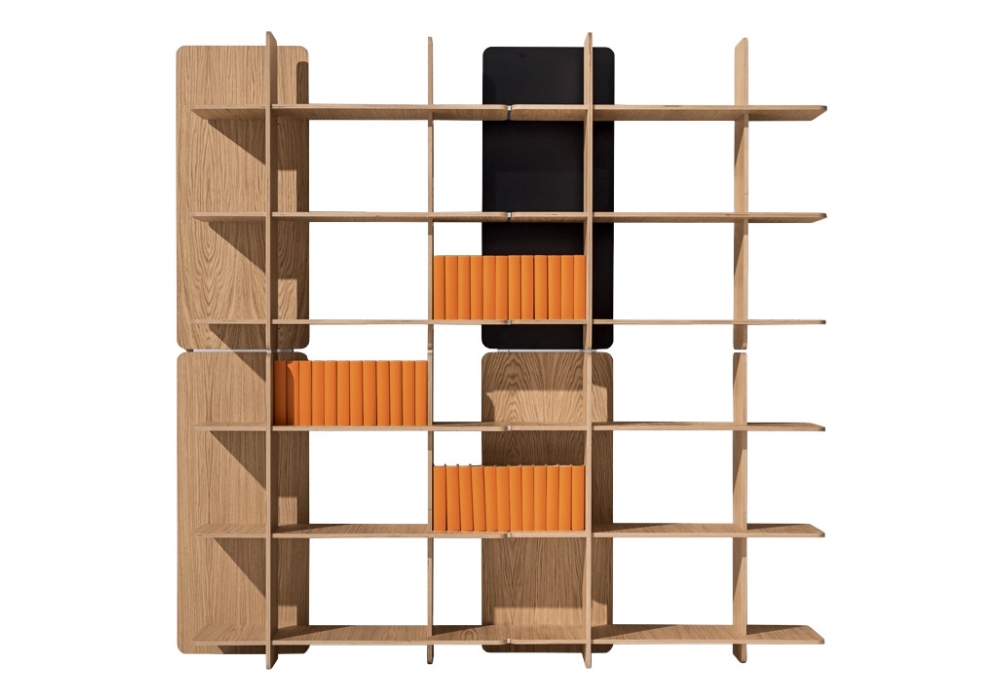 Axis designed by Studio Klass for Discipline is a modular bookcase in natural oak veneered wood with brushed aluminum joints. Available with back in natural oak or laminate in different finishes.