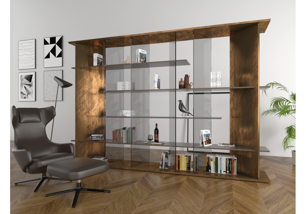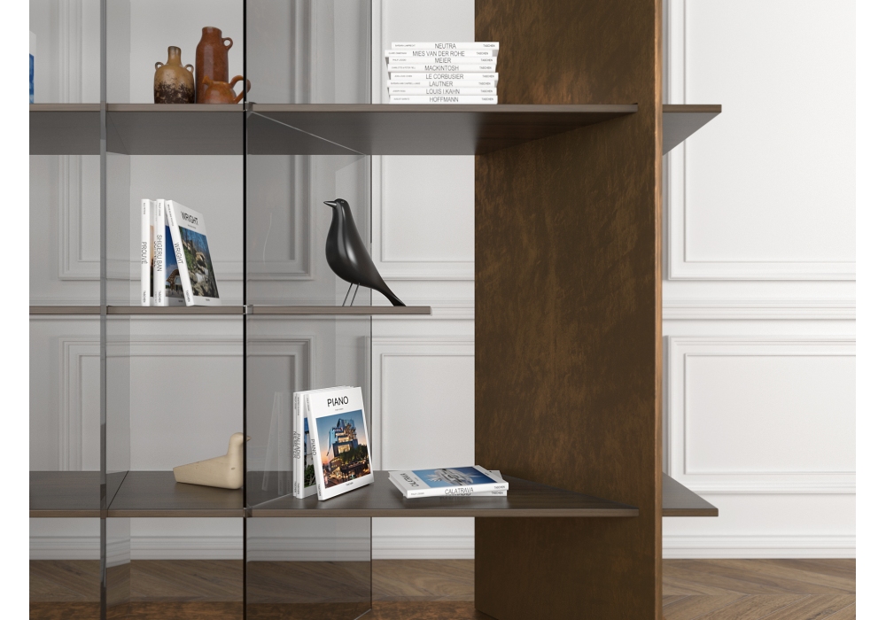 Degree designed by Serra By Milia for Escooh is a modular bookcase with metal supporting structure and glass side panels. The internal shelves are made of wood in different essences.