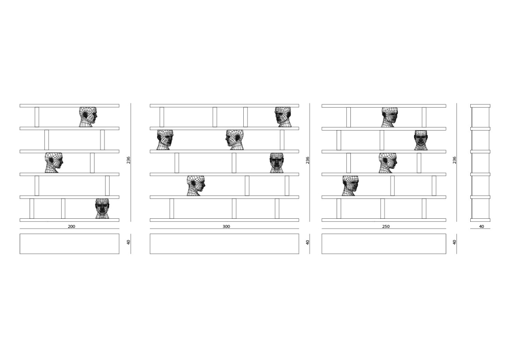 | Dimensions | 200 x 40 x H 236 cm; 250 x 40 x H 236 cm; 300 x 40 x H 236 cm. |