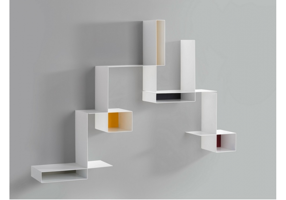 Randomissimo designed by Neuland Industriedesign for MDF Italia is a shelf with wall fixing, made of sheet steel, powder coated in matt white and graphite gray colors. Two formal typologies (module A and module B) which, by juxtaposition or by design, can create large size and image configurations. The shelf is complete with back panels covered in artificial fiber cloth complete with magnetic coupling. Available colors: white, black, gray, taupe, red, yellow and blue.