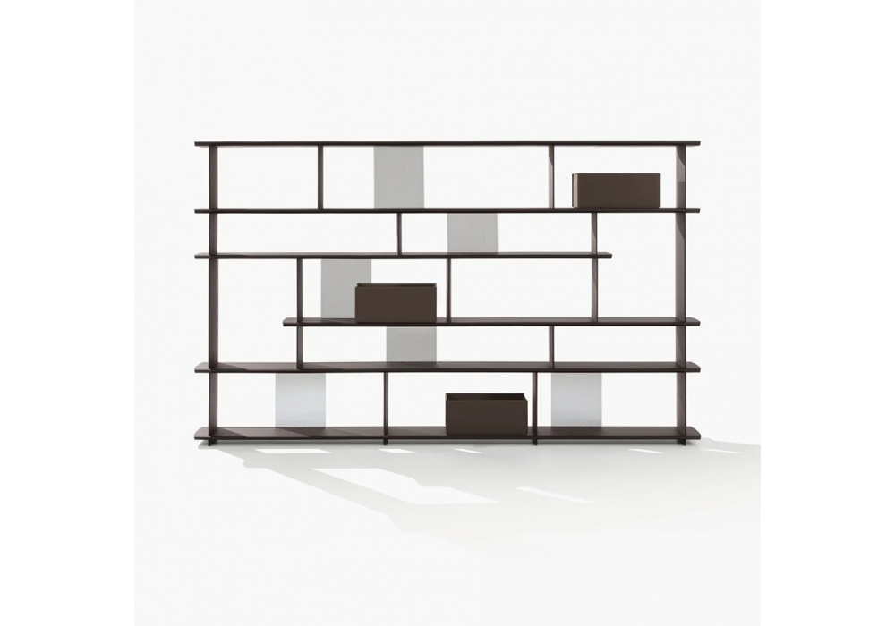Tess designed by Jean-Marie Massaud for Poliform is a bookshelf with a structure in medium density fibreboard veneered in black elm with sliding back panels in striped fumé or bronze glass. Optional boxes in leather colours.