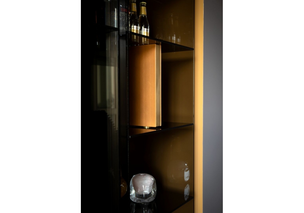 Amira designed by Baxter P. is a modular bookcase that interprets the living space with formal and compositional rigor. Designed as a freestanding structure, it is inspired by the architectural research of Luigi Moretti, evoking his experimental approach. Amira's combination of smoked glass, brass and marble generates a sober material balance, enriched by leather details that introduce a calibrated tactile contrast.
