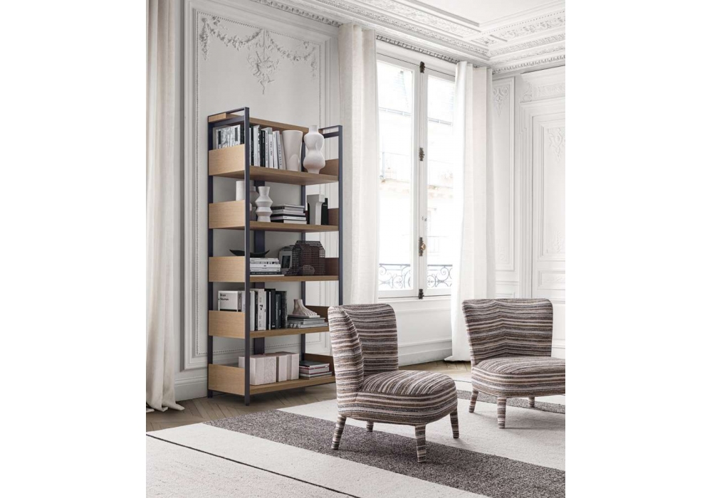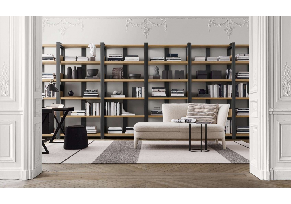 Eracle designed by Antonio Citterio for Maxalto is a bookcase with structure and shelves in solid oak or natural wenge. Base and upper profile top in bronzed nickel painted steel profiles.