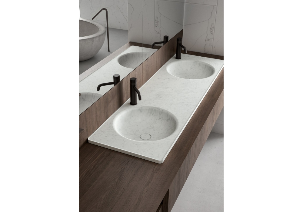 Floe Stone designed by Keiji Takeuchi is a built-in washbasin with integrated top complete with drain plug in washbasin finish, without overflow, with single or double basin. Optional tap holes, to be ordered separately.