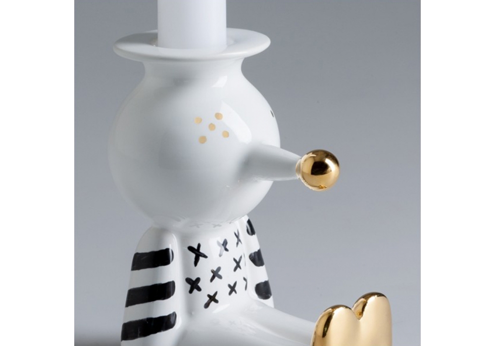 Pinocchietto designed by Jaime Hayon for Bosa is a candle holder in white ceramic with handmade decoration in glossy black and gold, that conjures up the image of the little puppet. Pinocchietto is an ironic ornament for the home and an amusing everyday object.
