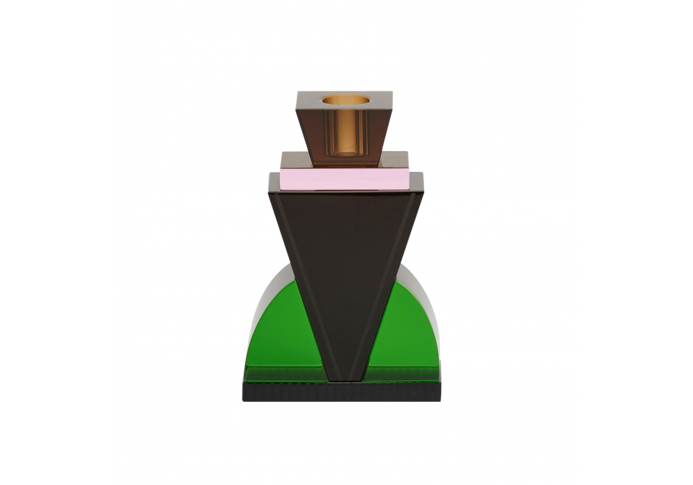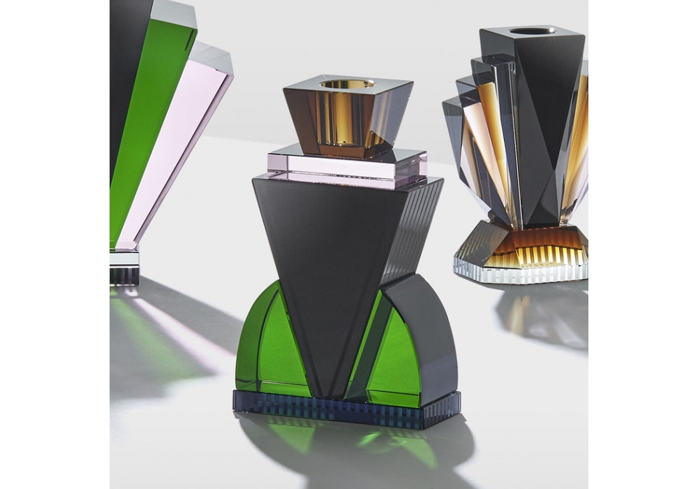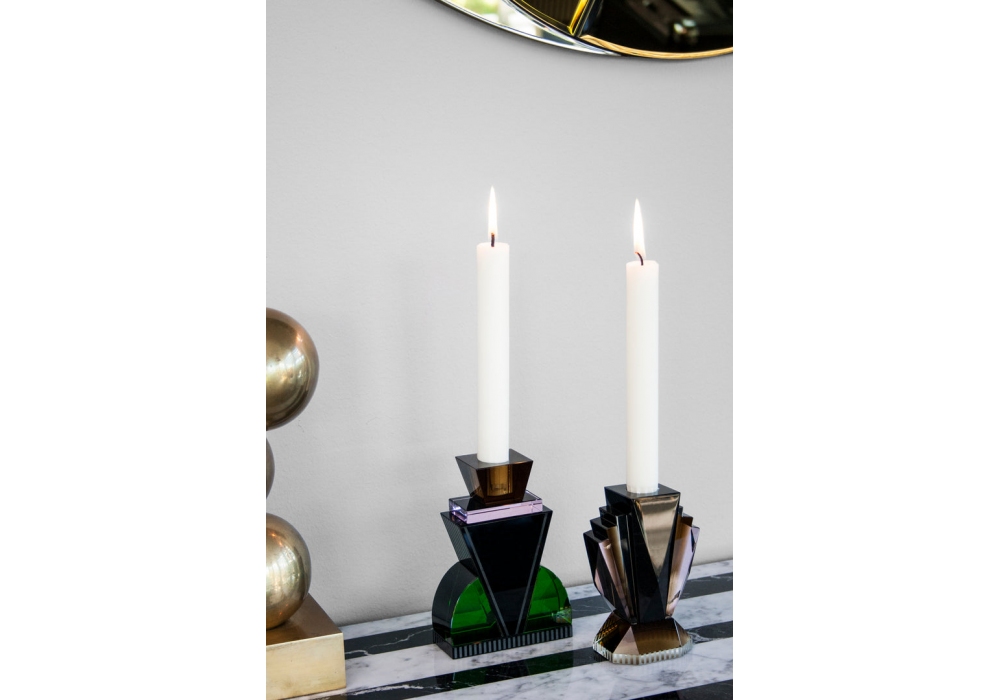 Queens produced and designed by Reflections Copenhagen is a crystal candle holder structured by various geometric elements carved and finished by hand in black, pink, brown and green.