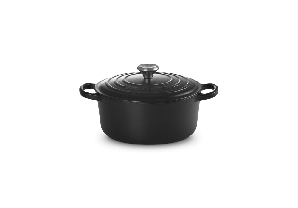 Cocotte Rotonda Evolution 22 designed by Le Creuset is a round cast iron casserole available in different colors. White interior finish except for the black casserole which has black interior.