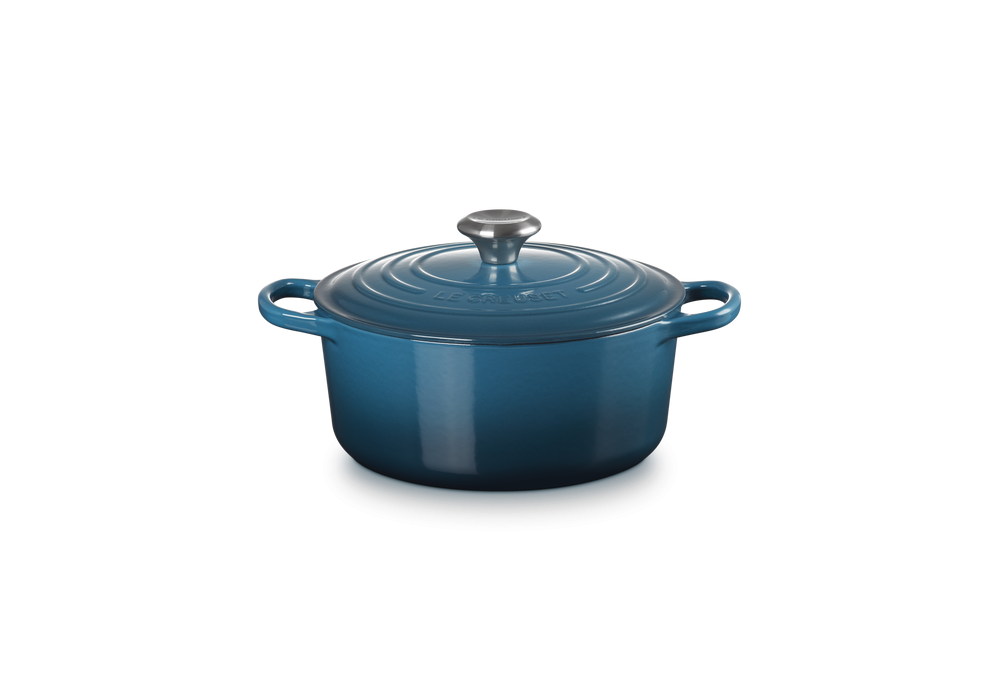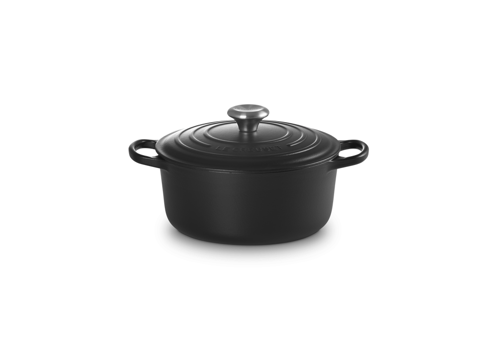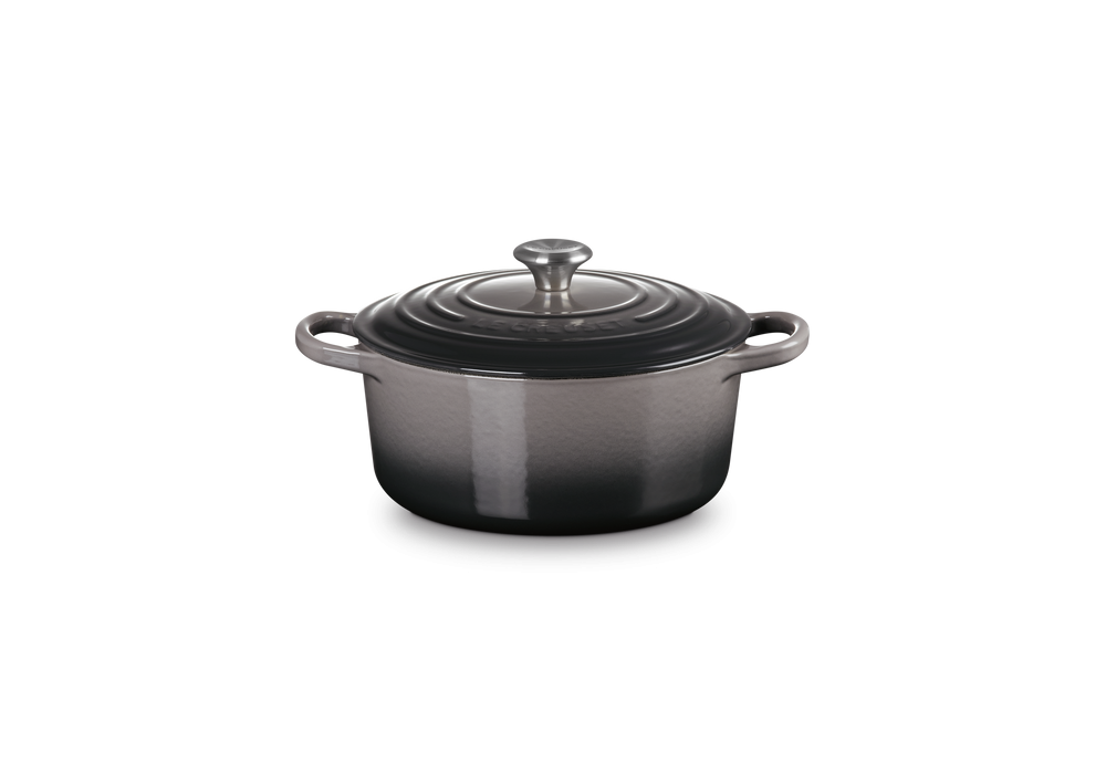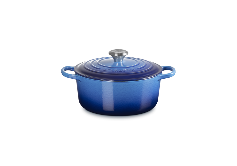 Cocotte Rotonda Evolution 24 designed by Le Creuset is a round cast iron casserole available in different colors. White interior finish except for the black casserole which has black interior.