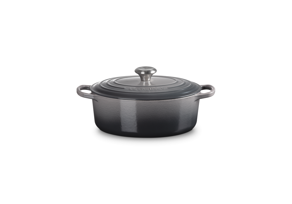 Cocotte Ovale Evolution 27 designed by Le Creuset is an oval cast iron casserole available in different colours. White interior finish except for the black casserole which has black interior.