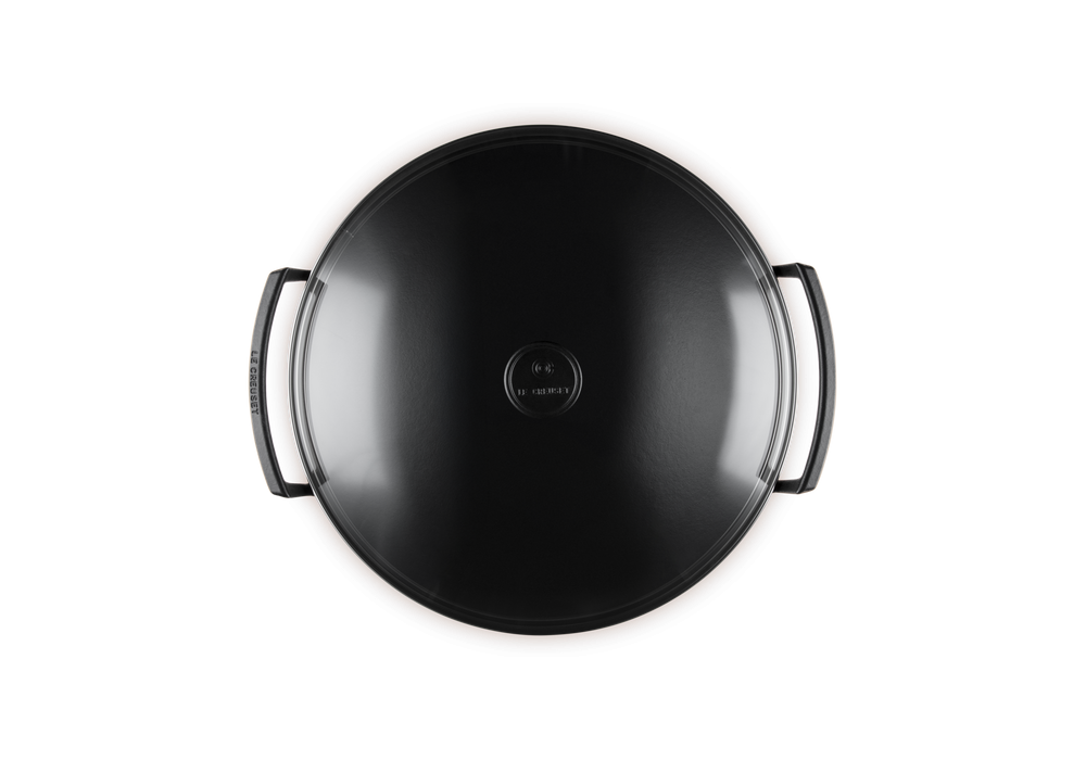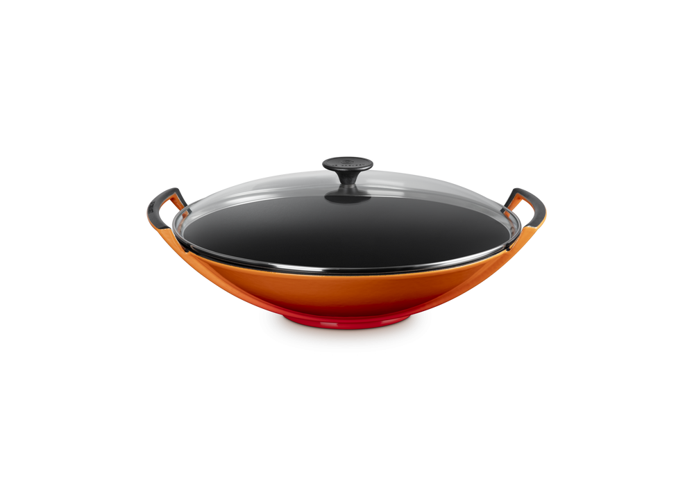 Wok con Coperchio in Vetro 36 designed by Le Creuset is a cast iron casserole with glass lid, available in different colours.
