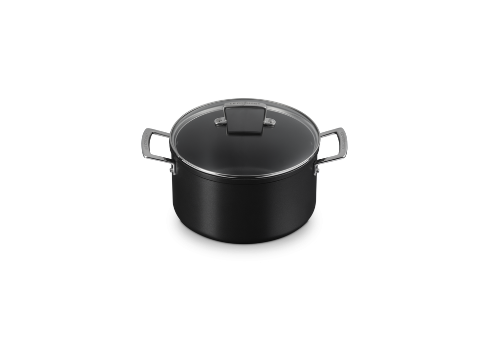 Pentola con Manici e Coperchio 24 designed by Le Creuset is a non-stick aluminum pot with glass lid.