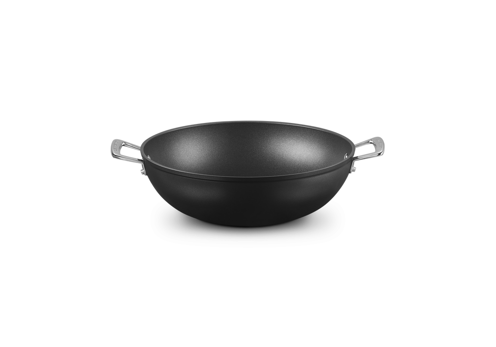 Padella Wok con Manici 32 designed by Le Creuset is a non-stick aluminum pan with handles.