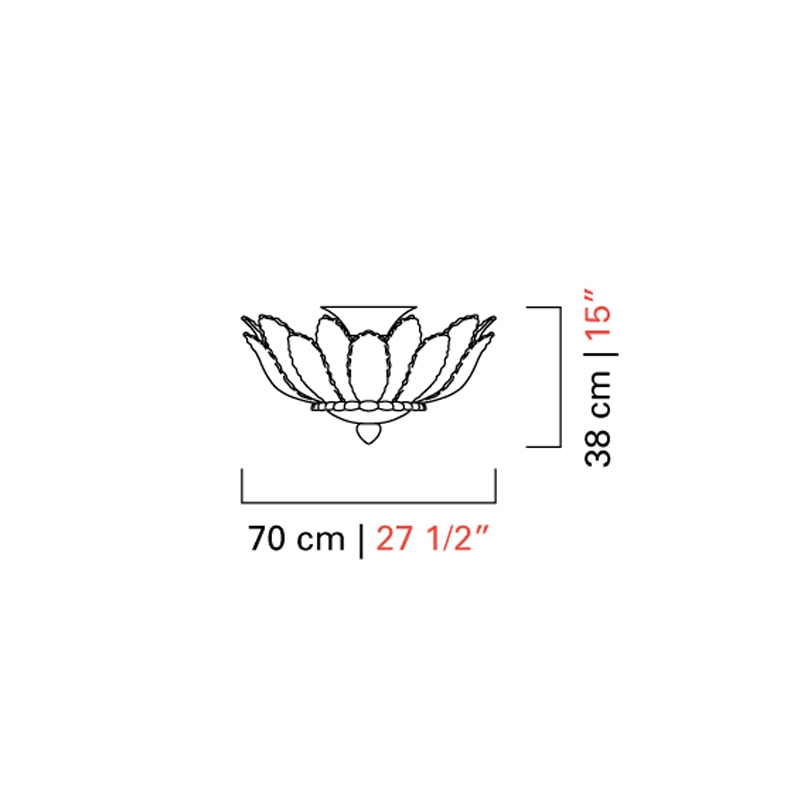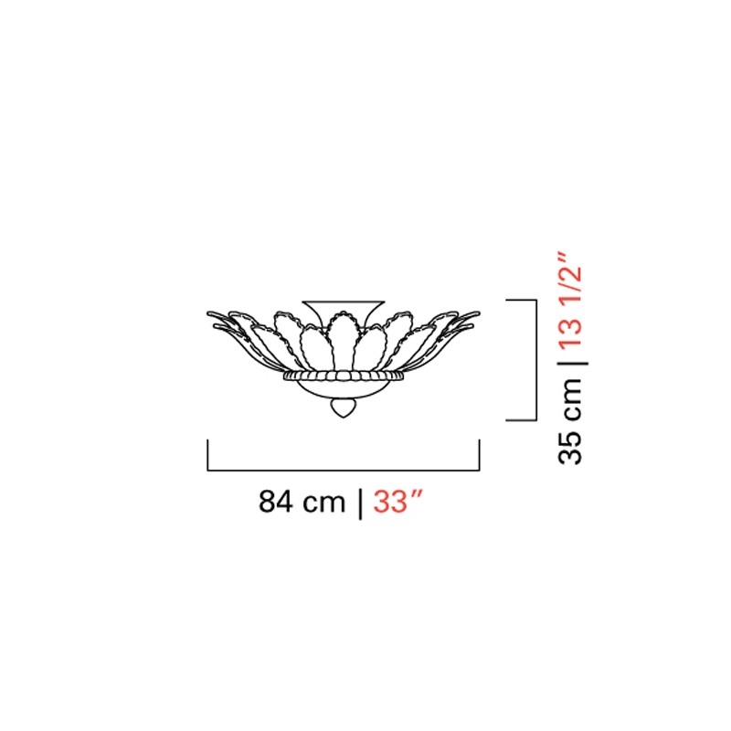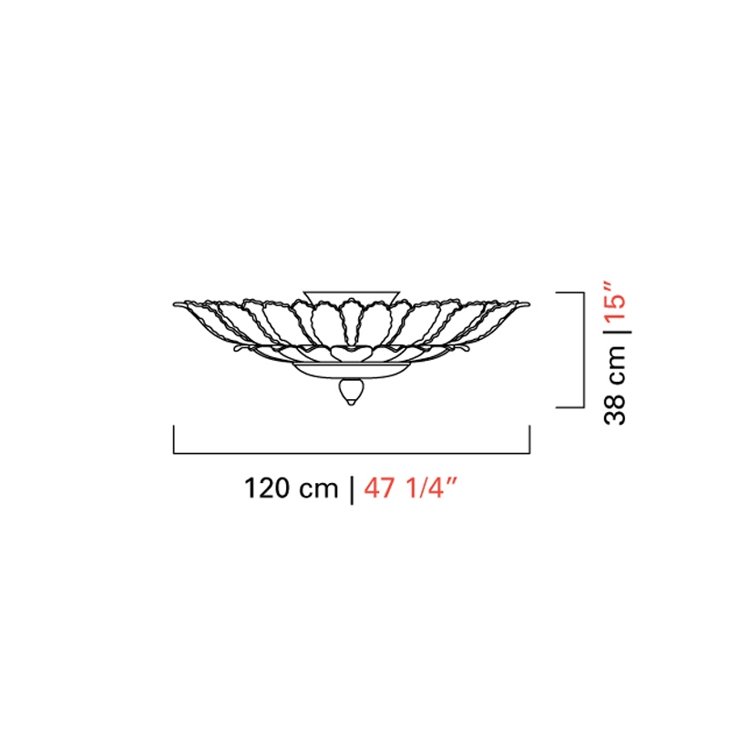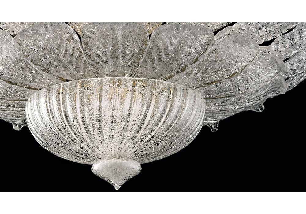 Excelsior designed and produced by Barovier & Toso is a ceiling lamp with supporting structure and visible parts in galvanized gold colored metal. The diffuser is structured by various applications in Venetian glass and shields the dimmable LED or halogen light sources. Excelsior is available in different models and glass finishes.