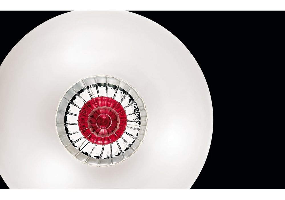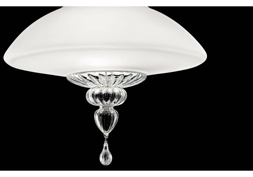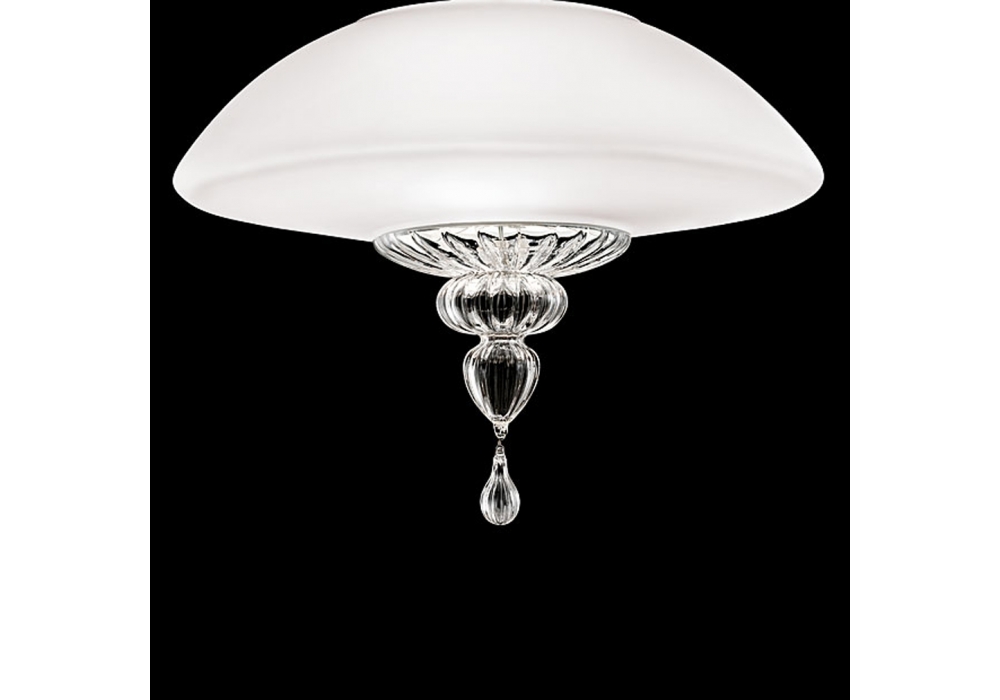Topkapi 7093 designed by Daniela Puppa for Barovier & Toso is a ceiling lamp with supporting structure and visible details in white painted metal. The diffuser is circular in shape in Venetian glass and shields the dimmable LED or halogen light sources. Topkapi 7093 is available in different models and finishes.