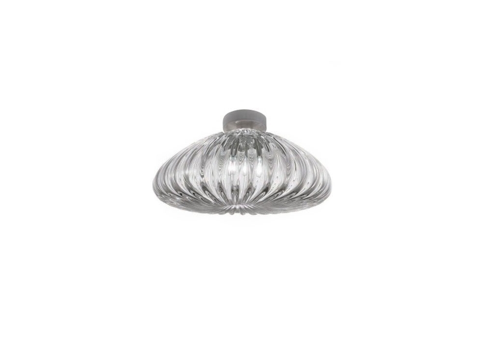 Diamante designed by Barbara Maggiolo for Vistosi is a ceiling lamp with structure in brushed nickel color metal. The diffuser is made of circular glass with a striped surface and shields a dimmable LED or halogen light source with E27 fitting. Diamante is available in different diffuser finishes.