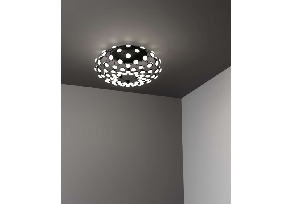 Mesh designed by Francisco Gomez Paz for Luceplan is a LED ceiling lamp with black steel structure and opal white polycarbonate lenses.