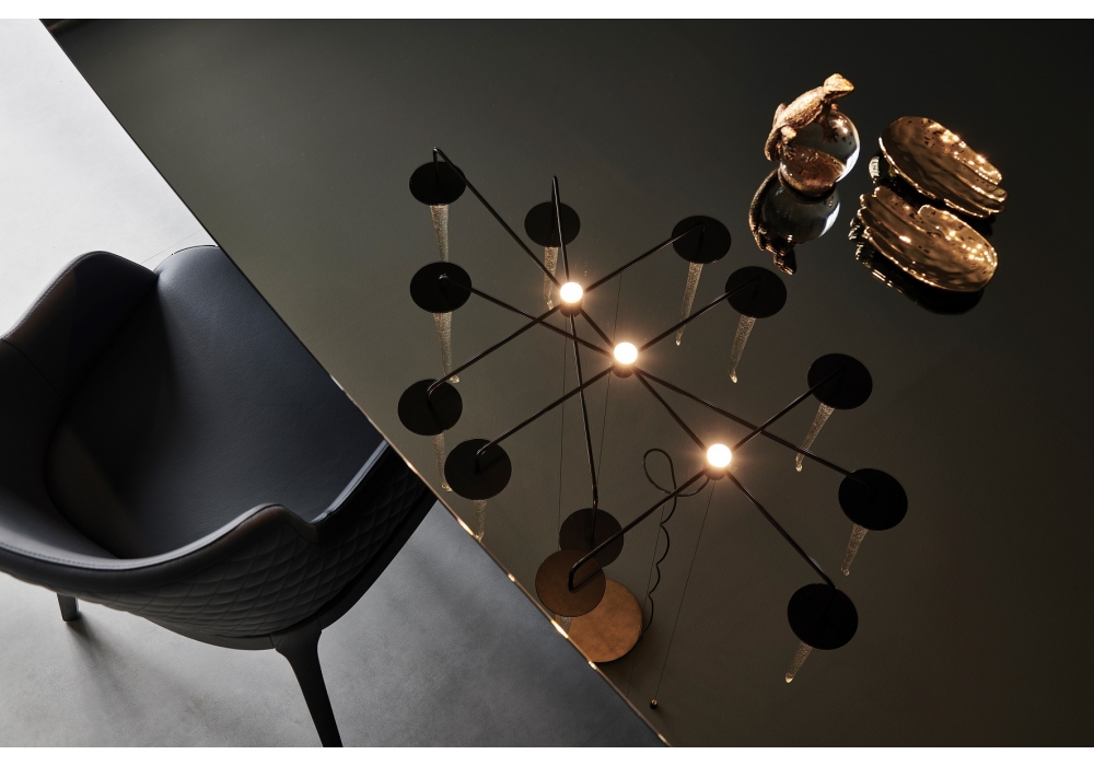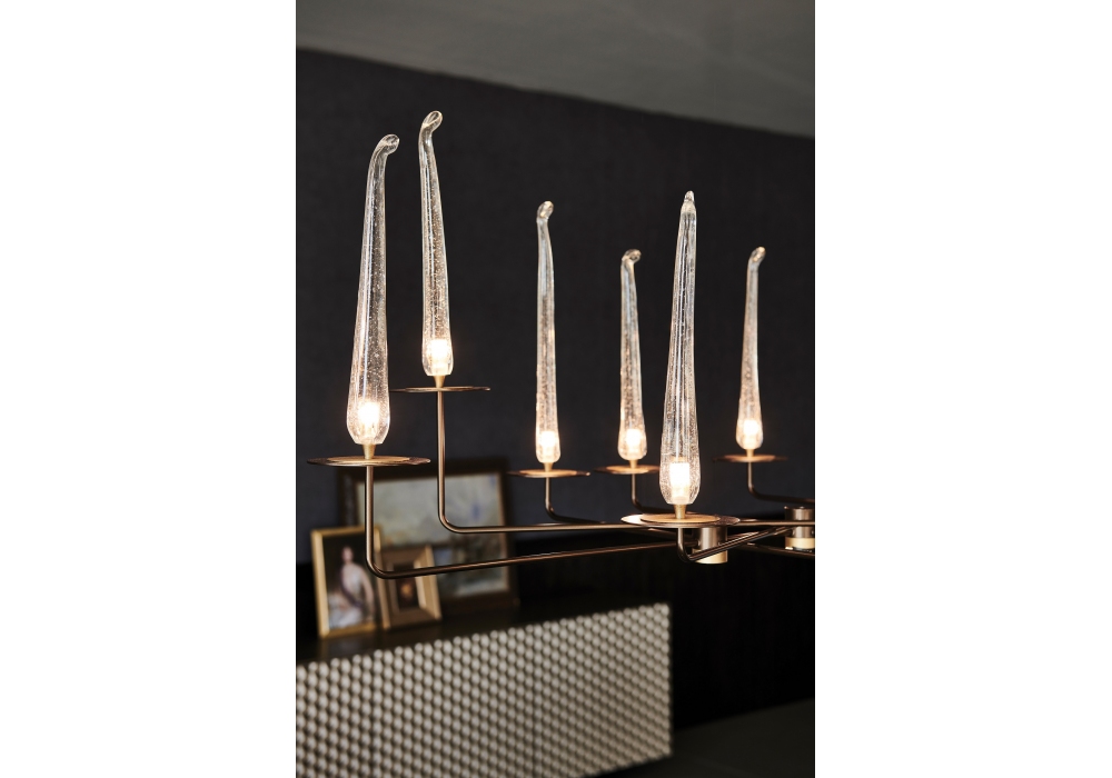 Lancelot designed by Oriano Favaretto for Cattelan Italia is a ceiling lamp with candle shape elements in handmade pulegoso Murano glass. Structure in bronze embossed lacquered steel. Downward and upward led lighting. Every glass element is unique and different in size and shape.
