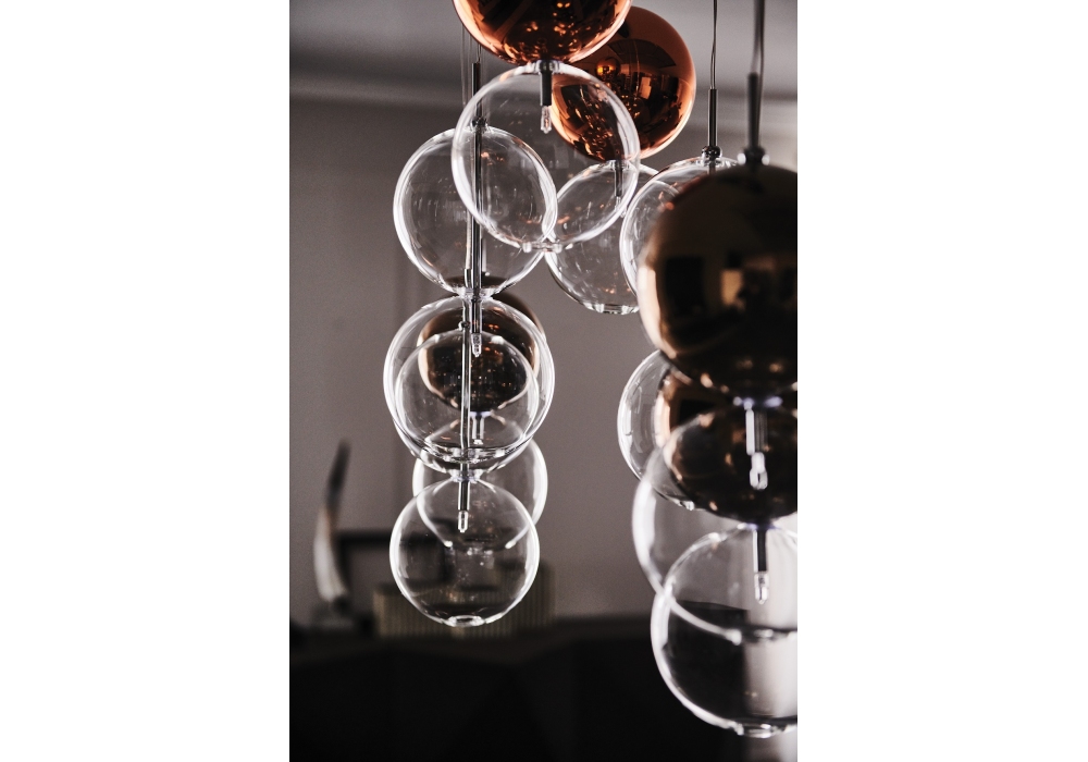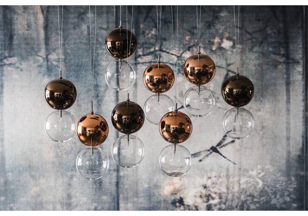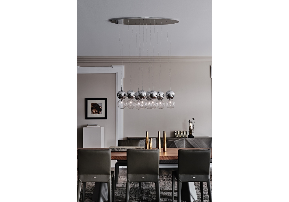 Apollo designed by Oriano Favaretto for Cattelan Italia is a ceiling lamp with lampshade made of 2 spheres in borosilicate glass. Lower sphere in transparent glass and upper sphere in transparent glass or painted chrome, copper, bronze. Ceiling fixing in stainless steel.