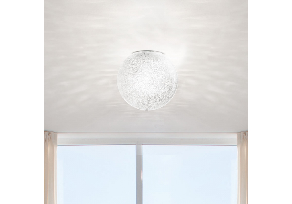 Rina designed by Barbara Maggiolo for Vistosi is a ceiling lamp with circular metal supporting structure in satin nickel colour. The diffuser is in white murrina glass with a porous surface and adopts a LED or halogen light source with E27 fitting. Rina is available in different models.