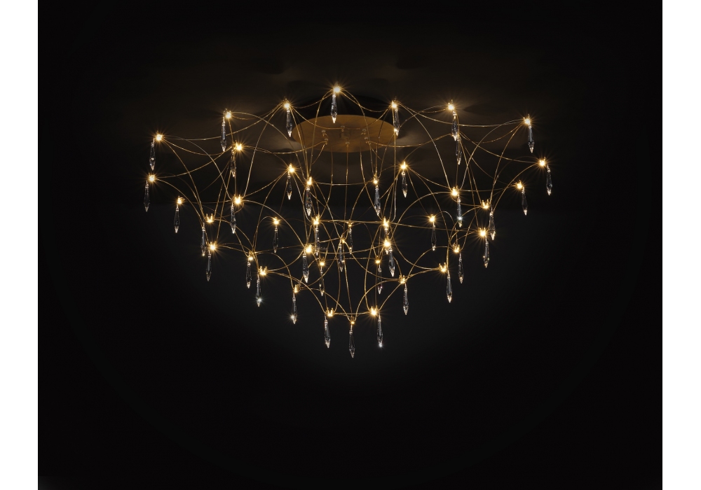 Mira designed by Jan Pauwels for Quasar is a ceiling lamp structured by painted metal rods adorned with Swarovski crystal pendants. The light sources used are LED and are available on request in 2400 K° shades. Mira is available in different models.