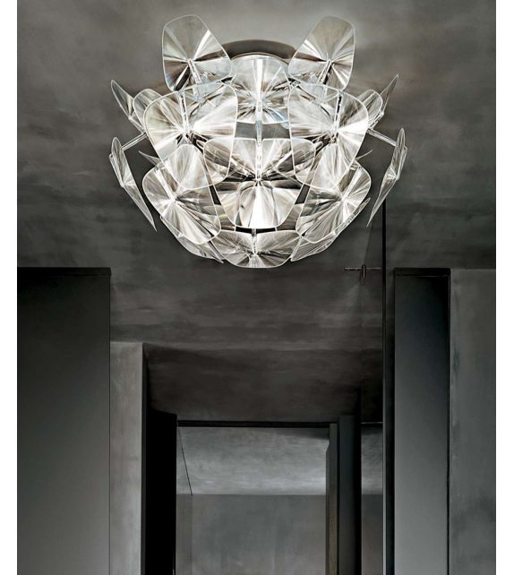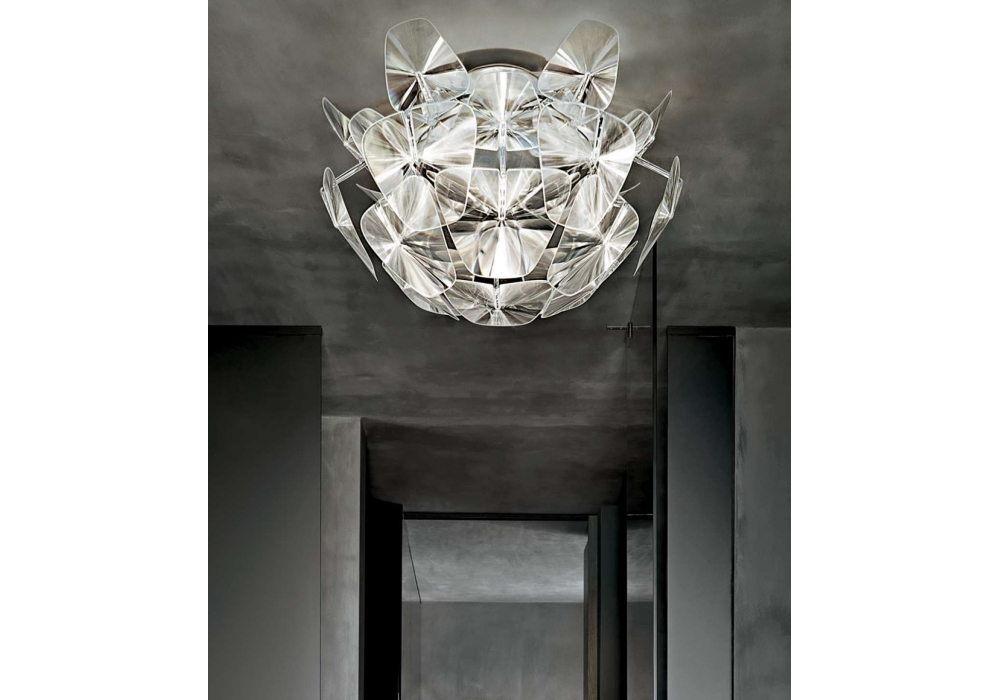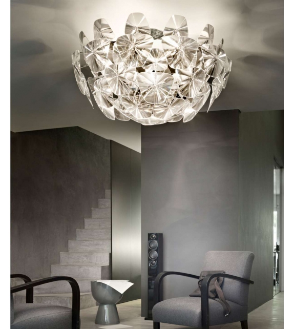 Hope designed by Francisco Gomez Paz and Paolo Rizzatto for Luceplan is a ceiling lamp with structure in polished steel and transparent polycarbonate. Prismatic lenses in methacrylate. It is designed for all light sources. Available in different dimensions.