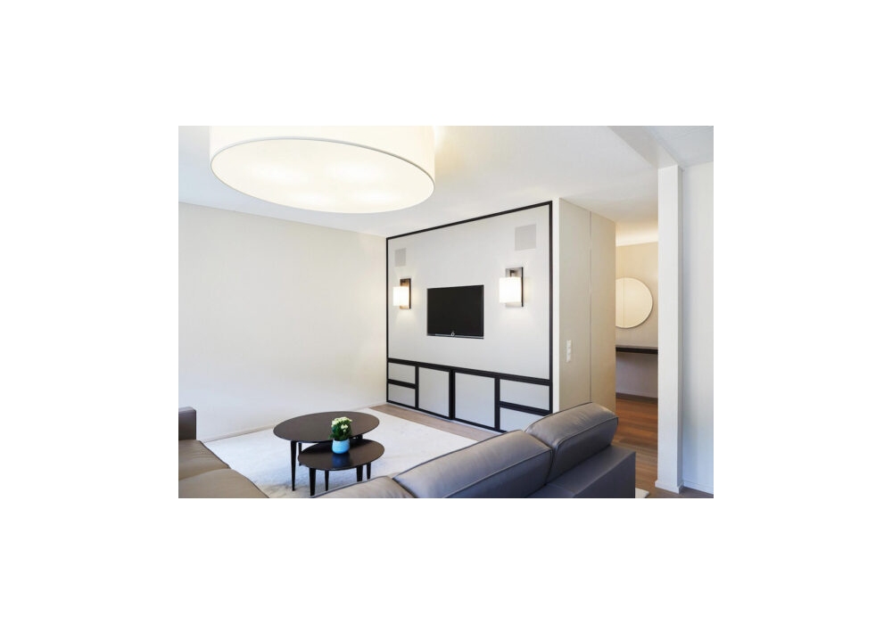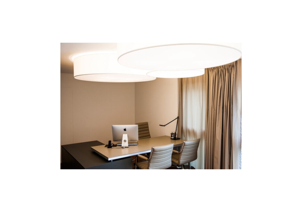 Circus designed by Contardi Studio is a ceiling lamp composed of a white lacquered structure and lampshade in cotton, linen, marble effect fabric or bouclé fabric.