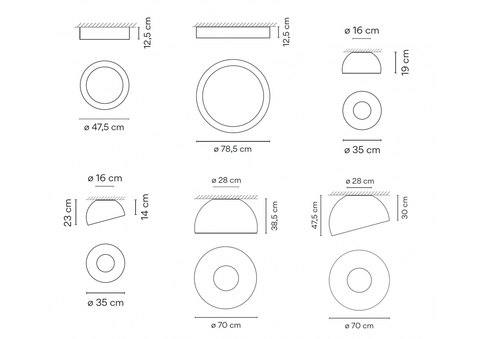 | Dimensions | Ø 47,5 x H 12,5 cm; Ø 78,5 x H 12,5 cm; Ø 35 x H 19 cm; Ø 35 x H 23/14 cm; Ø 70 x H 38,5 cm; Ø 70 x H 47,5/30 cm. |