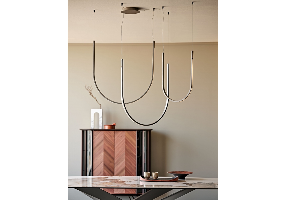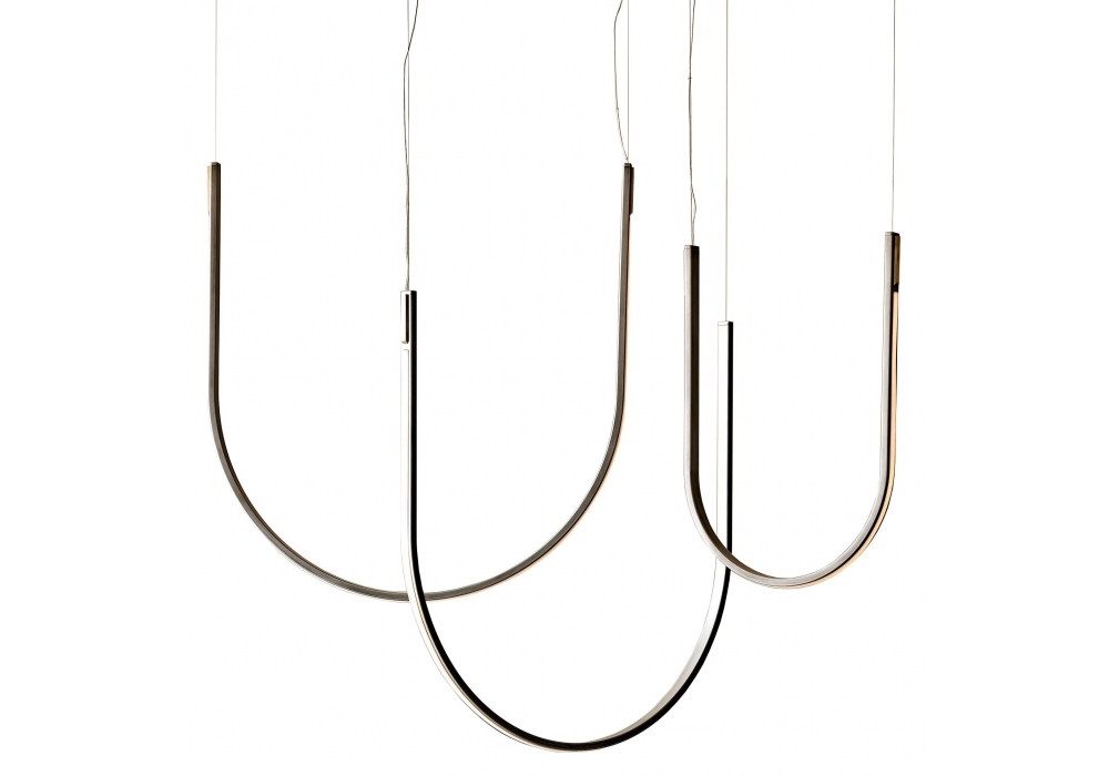 Nahun designed by Studio Kronos for Cattelan Italia is a LED ceiling lamp with structure in satin Iron Grey embossed lacquered steel and brass details. Ceiling plate in in black chrome steel. Available with remote control and dimmer. Available in several dimensions.