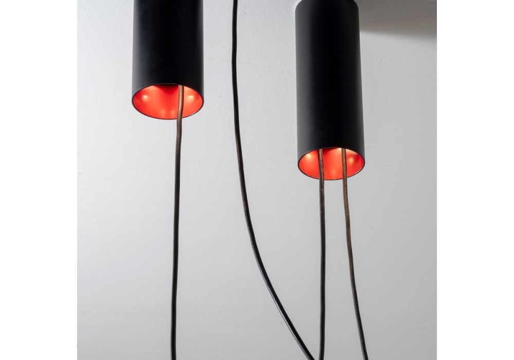 Cordon designed by Serge & Robert Cornelissen for Martinelli Luce is a ceiling lamp structured by several tubular aluminum elements. The lamp body is painted black on the outside and red or white on the inside. The light source used is of the LED type. Cordon is available in different versions.