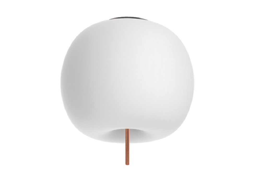 Kushi XL designed by Alberto Saggia & Valerio Sommella for Kundalini is a ceiling lamp with diffuser in layered and blown opal glass and structure in painted metal in the finishes: black, copper and brass.