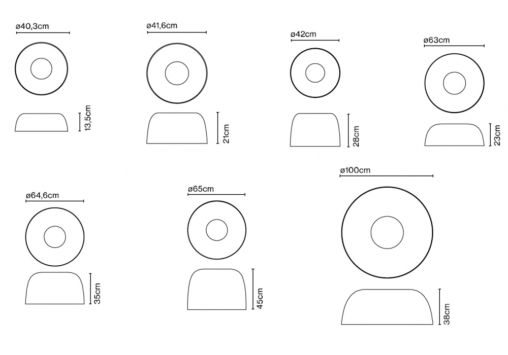 | Dimensions | • Ø 40,3 x H 13,5 cm; • Ø 41,6 x H 21 cm; • Ø 42 x H 28 cm; • Ø 63 x H 23 cm; • Ø 64,6 x H 35 cm; • Ø 65 x H 45 cm; • Ø 100 x H 38 cm |