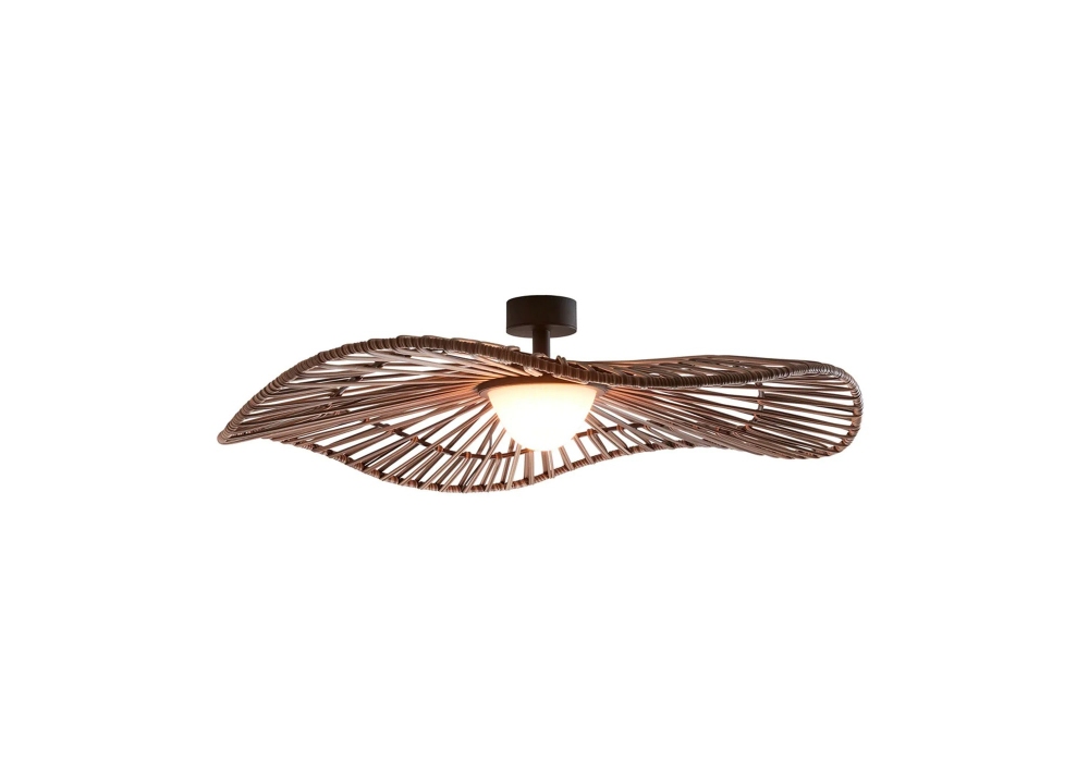 Mediterrània Outdoor designed by Alex Fernández Camps for Bover is an outdoor ceiling lamp with support and supporting structure in painted metal and aluminium. The lampshade is in brown synthetic fiber with a polycarbonate diffuser and shields a LED-type light source with Triac dimmability system.